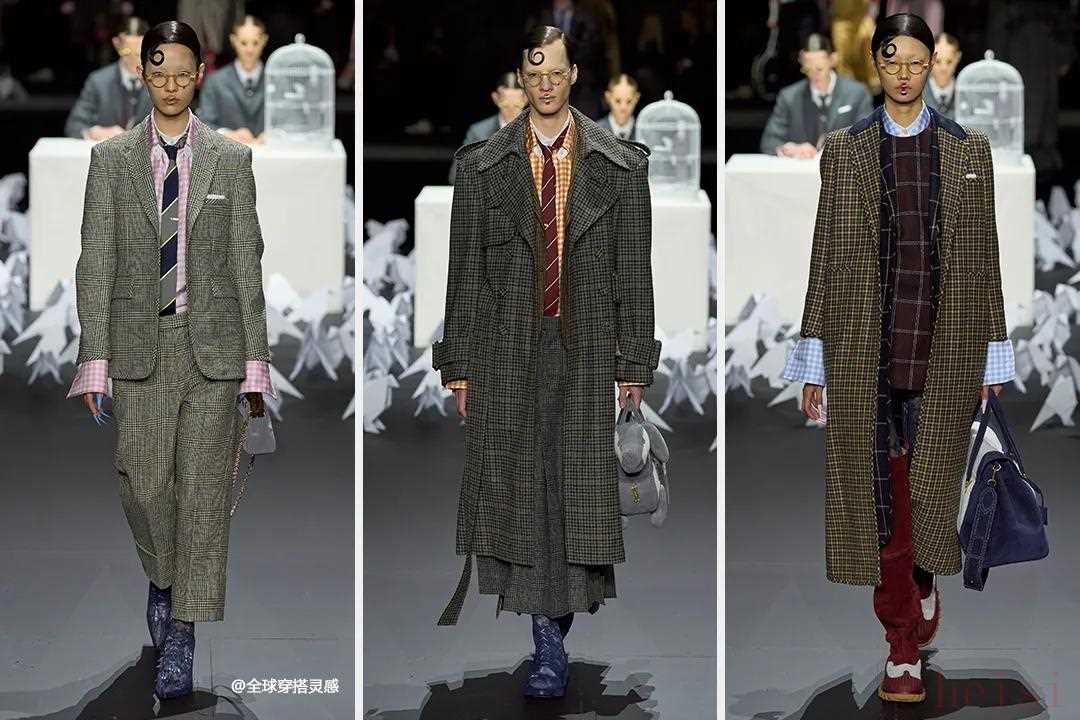 Thom browne主打格雷系的格紋西裝、長(zhǎng)大衣進(jìn)一步強(qiáng)化了叛逆學(xué)院風(fēng)的態(tài)度