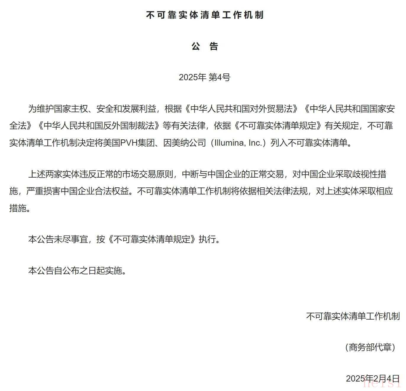 公告顯示,為維護(hù)國(guó)家主權(quán)、安全和發(fā)展利益,根據(jù)《中華人民共和國(guó)對(duì)外貿(mào)易法》《中華人民共和國(guó)國(guó)家安全法》《中華人民共和國(guó)反外國(guó)制裁法》等有關(guān)法律,依據(jù)《不可靠實(shí)體清單規(guī)定》有關(guān)規(guī)定,不可靠實(shí)體清單工作機(jī)制決定將美國(guó)PVH集團(tuán)列入不可靠實(shí)體清單,并將依據(jù)相關(guān)法律法規(guī),對(duì)上述實(shí)體采取相應(yīng)措施。