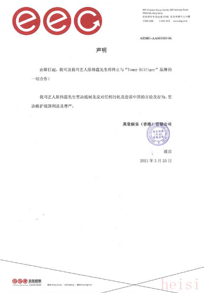 英皇娛樂――北京也發(fā)聲明稱,由即日起,我司及我司藝人陳偉霆終止與“Tommy Hilfiger”品牌的一切合作。