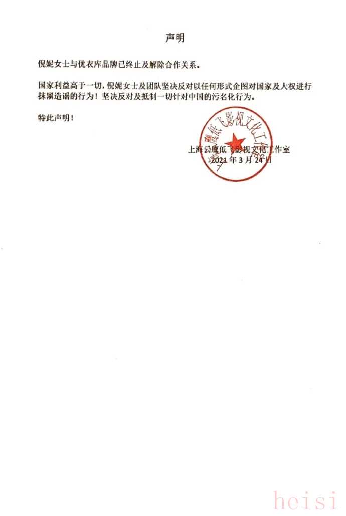 隨后,倪妮、井柏然、王源工作室先后宣布終止與“優(yōu)衣庫”品牌的合作。