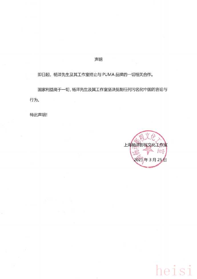 李現(xiàn)、劉昊然、楊洋工作室發(fā)布聲明稱,即日起,李現(xiàn)、劉昊然、楊洋將終止和PUMA(彪馬)品牌的一切合作關(guān)系。