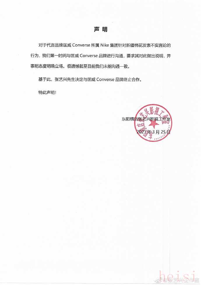 25日下午,張藝興工作室官方微博連發(fā)兩條聲明,宣布終止與匡威、CK的合作。張藝興工作室表示,對于代言品牌匡威Converse所屬Nike集團針對新疆棉花發(fā)表不實言論的行為,我們第一時間與匡威Converse品牌進行溝通,要求其對此做出說明,并表明態(tài)度明確立場。很遺憾截至日前我們未能溝通一致。