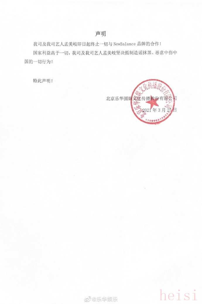 樂華娛樂官方微博25日晚間再發(fā)聲明稱,我司及我司藝人孟美岐即日起終止一切與NewBalance品牌的合作。
