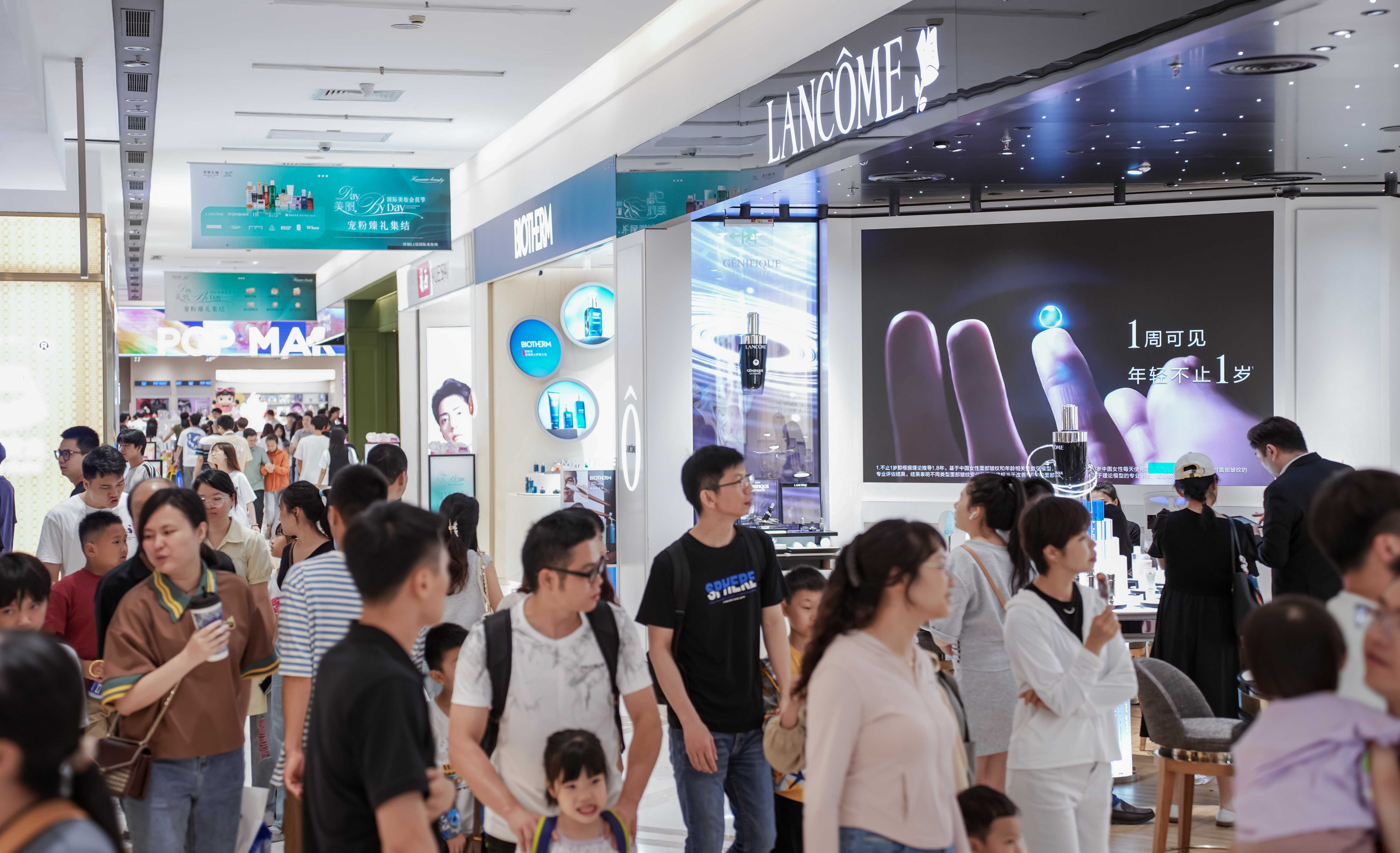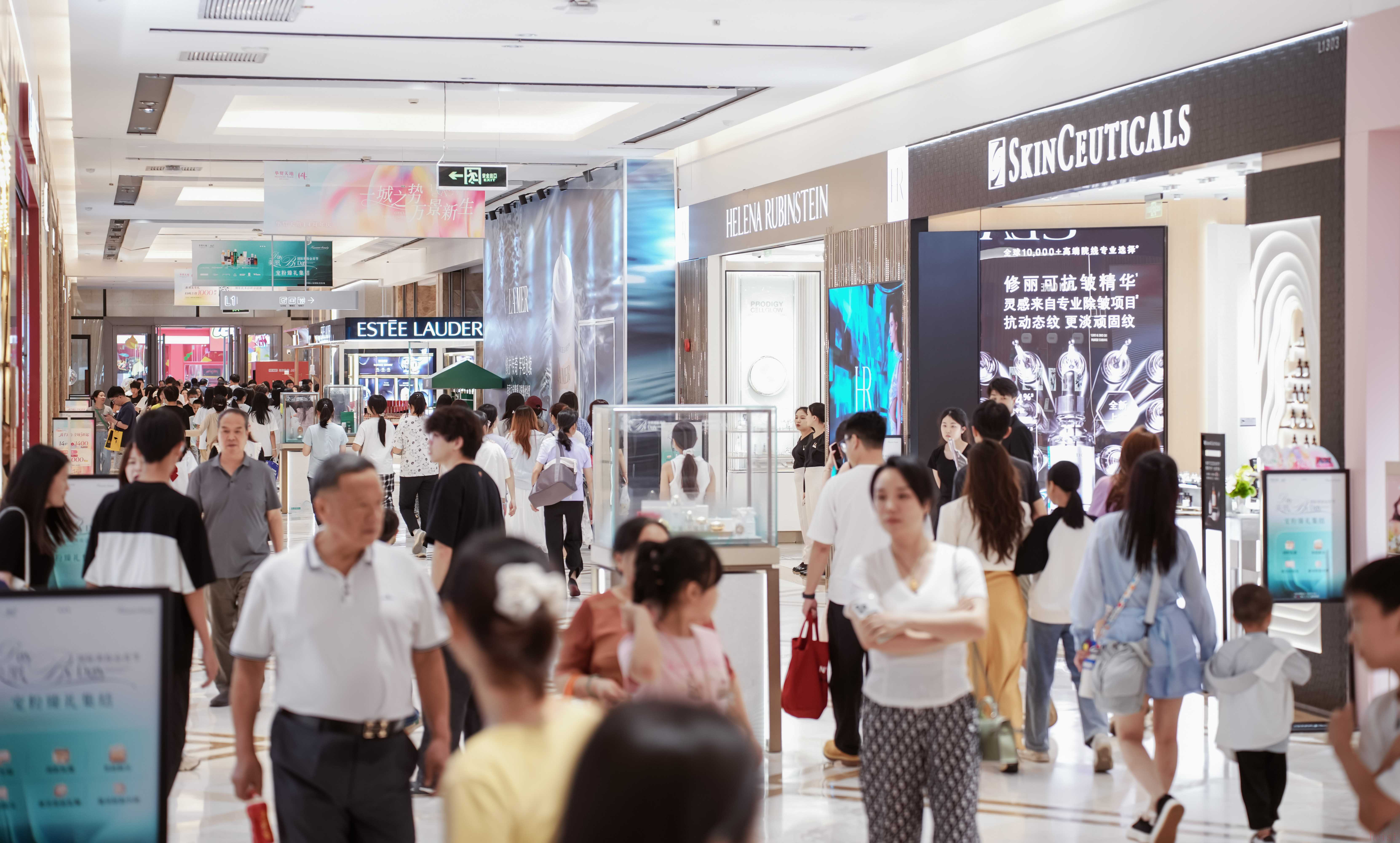 00后大學生正在試涂人生第一支正紅色唇膏;精致白領專注比對修護產(chǎn)品的成分表;年輕父母推著嬰兒車選購母嬰護理用品……在華貿(mào)天地的美妝長廊,這樣的場景每天都在反復上演。