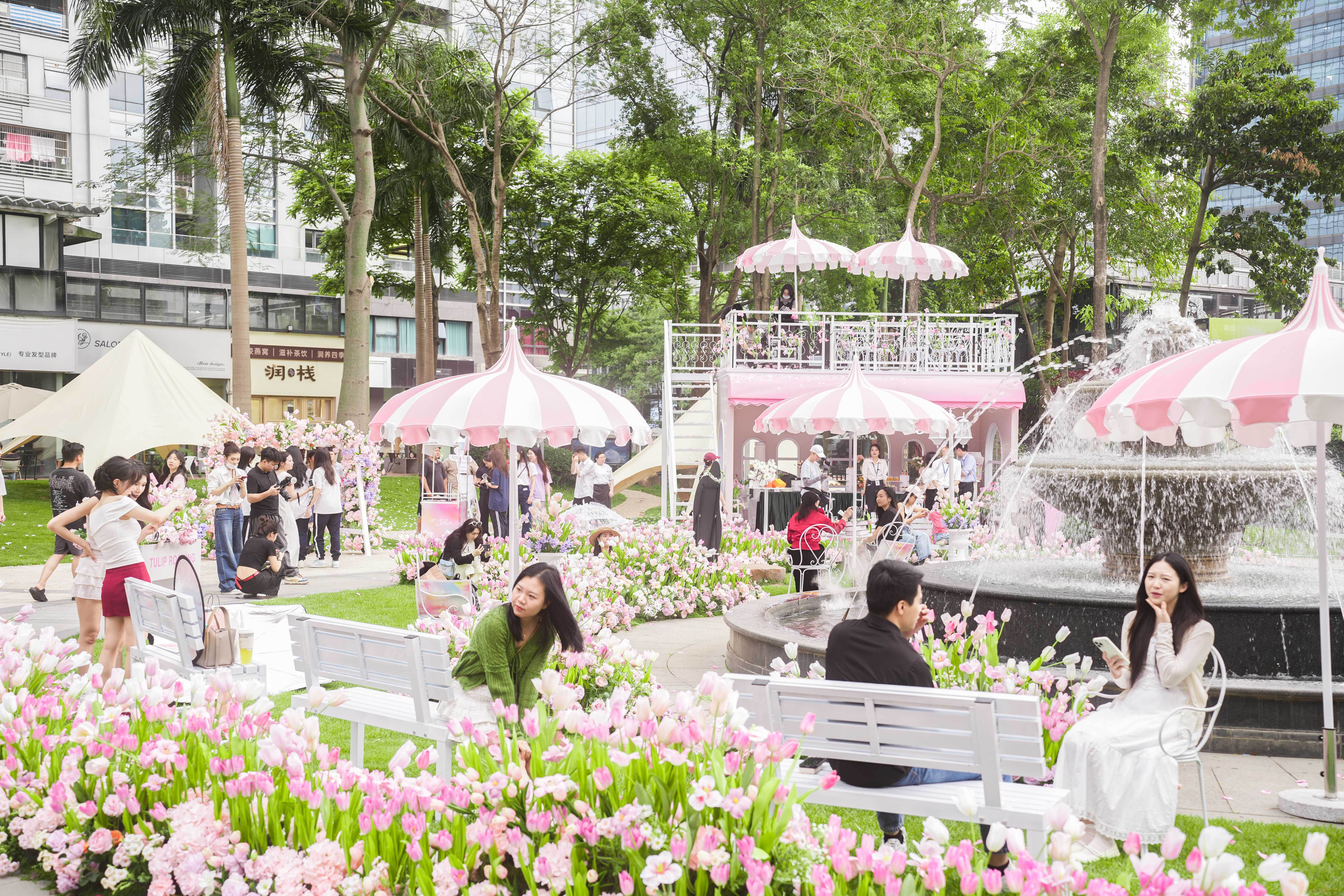 除了顆粒感十足的矩陣促銷優(yōu)惠,迎來14周年生日的華貿天地還在城市商場里打造出“漫生之境”,放眼望去一片花海,長椅、噴泉、遮陽傘,還有各色打卡空間,齊聚眾多浪漫元素。用公共空間編織出3000平方米規(guī)模的城市客廳,既為自己慶生,更為都市疲憊的身軀打造靈魂的休憩所。