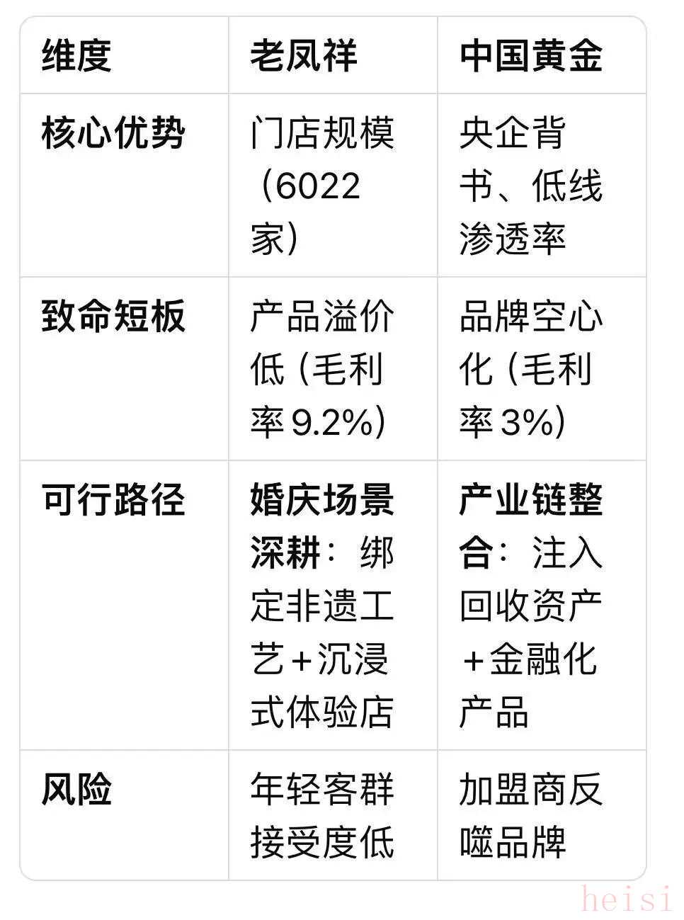 ——老鳳祥更需“產(chǎn)品革命”*:若無法在3年內(nèi)打造出具有文化溢價(jià)的核心產(chǎn)品線(如“鳳祥喜事”高端定制系列),將徹底淪為渠道商,被周大福、潮宏基擠壓生存空間。 ——中國(guó)黃金必須“重構(gòu)品牌”:繼續(xù)賣貼牌授權(quán)等于飲鴆止渴。需壯士斷腕:削減低質(zhì)加盟店,通過央企資源獲取免稅或金融牌照,轉(zhuǎn)型為“貴金屬服務(wù)商”。結(jié)論:要么向上突破,要么向下沉淪
