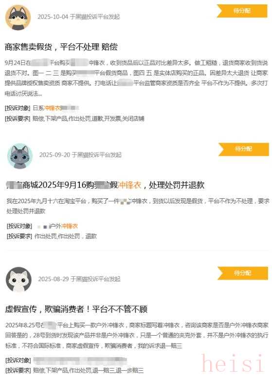 關(guān)于沖鋒衣的投訴(圖源黑貓投訴)