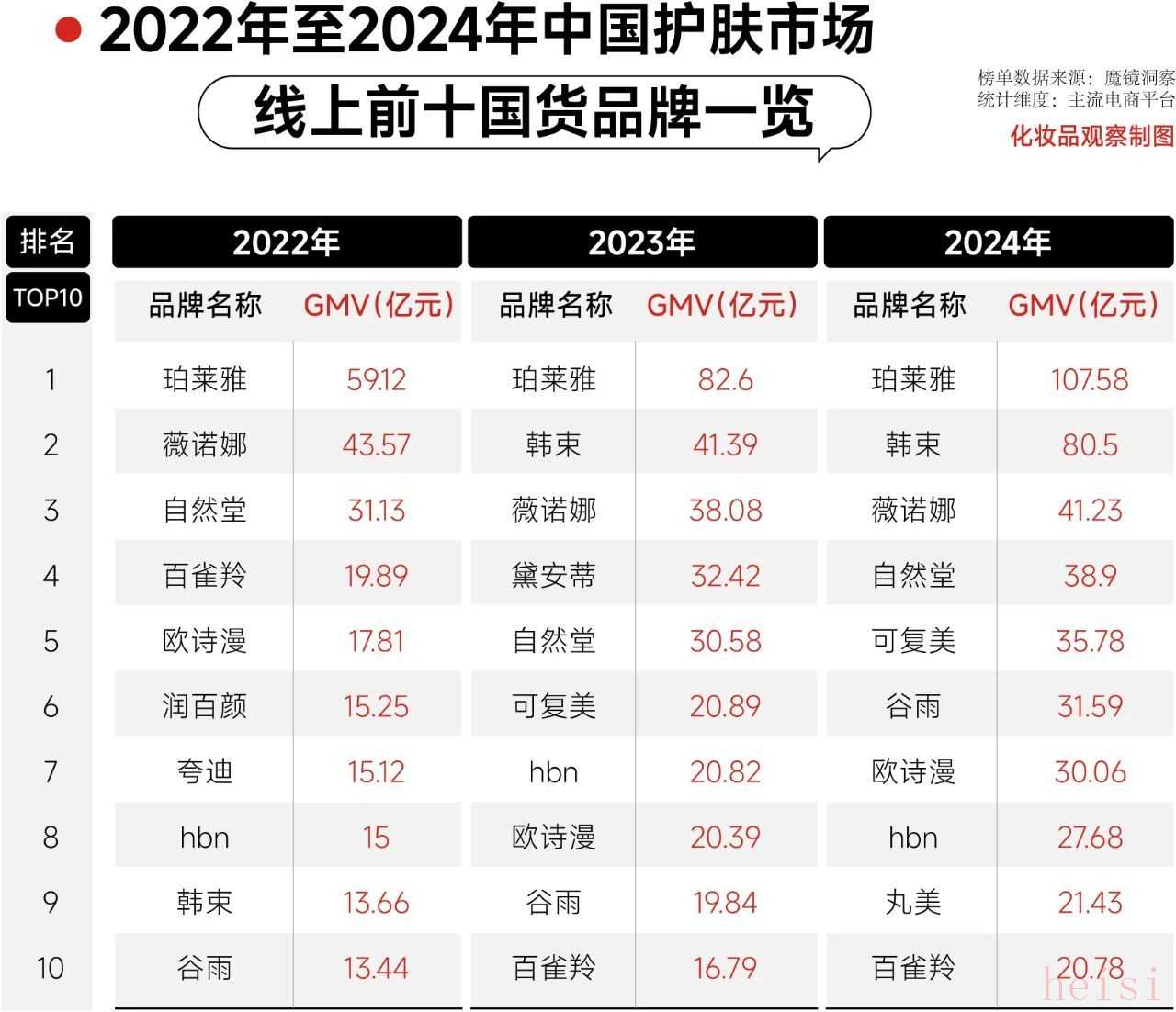 1.2022年至2024年排行榜取自魔鏡洞察,主要為各品牌在主流電商平臺的累計數(shù)據(jù)。近年來,線上已成為美妝銷售的主要渠道,比如,珀萊雅2024年上半年的線上渠道占比已達到93.69%;上美股份(韓束母公司)2024年的線上渠道占比也已超90%。故而,品牌在主流電商平臺的累計排行具備一定的參考性。