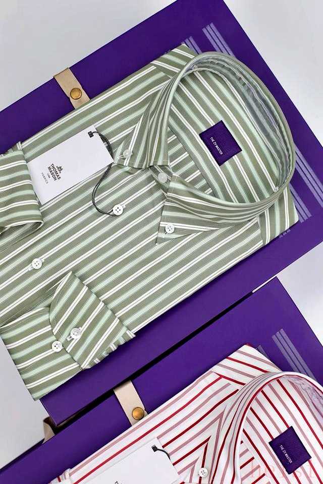 這款 "Thomas Mason" 的秋日雙彩虹手工條紋襯衫確實(shí)是一件非常吸引眼球的襯衫,它完美地融合了幾個(gè)時(shí)尚元素:
