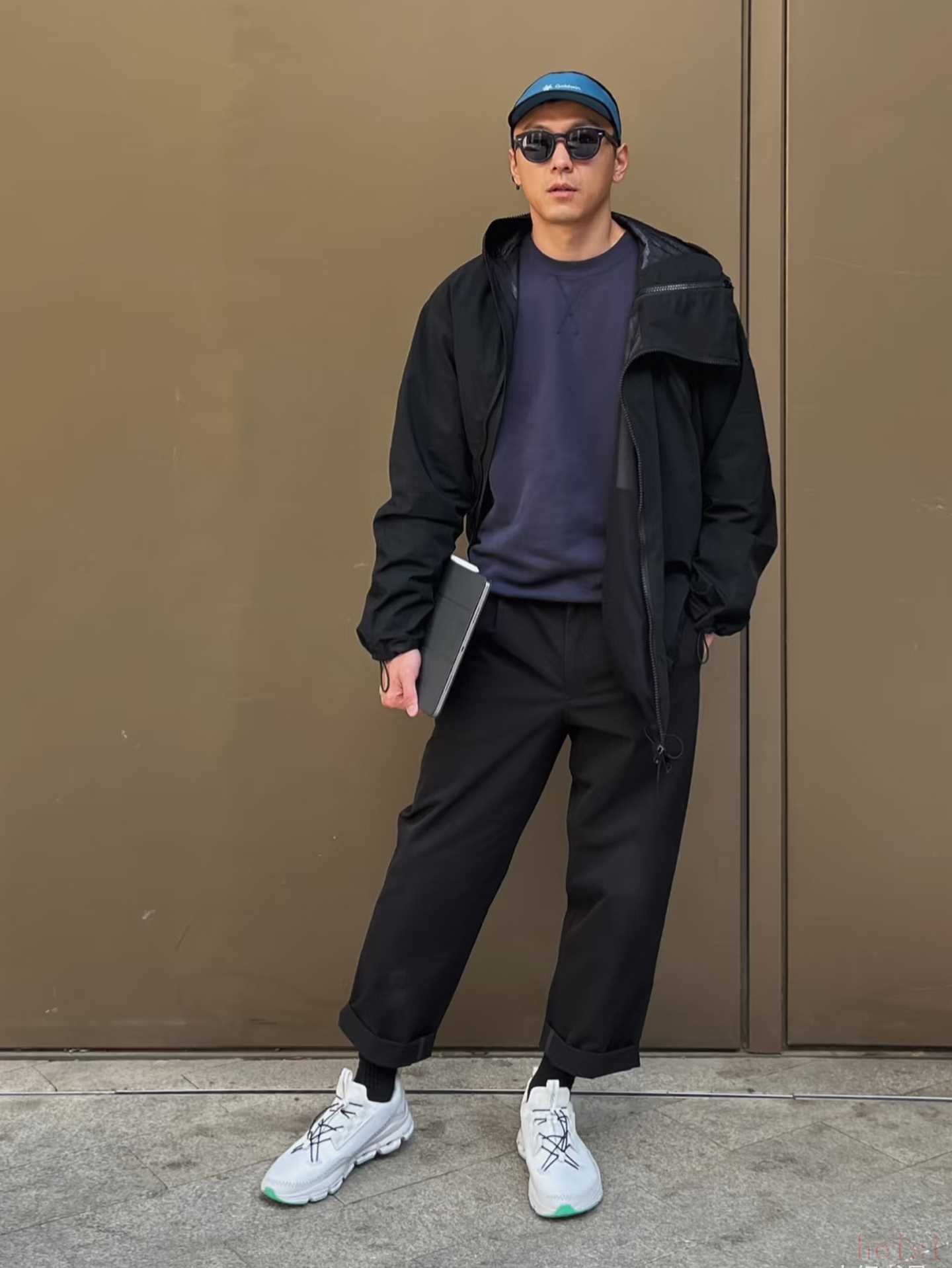 當(dāng)服裝同色時(shí),建議搭配撞色系的鞋子和配飾,比如黑色上衣+褲子,搭配白色中產(chǎn)運(yùn)動(dòng)鞋以及藍(lán)色帽子,冷暖結(jié)合、亮色點(diǎn)綴,整體造型更有層次感。