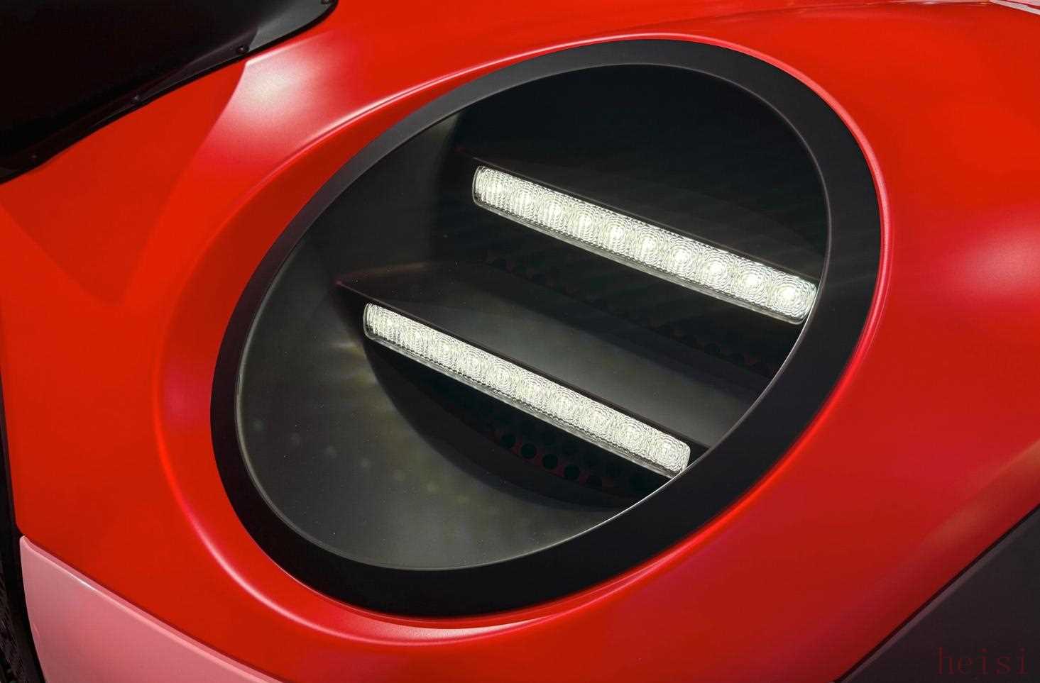 燃油版MINI JCW概念車Machina的外觀設(shè)計充滿復(fù)古賽車韻味,同樣采用寬體設(shè)計。車頭兩側(cè)大燈拆除,換成了通風(fēng)孔,僅保留日間行車燈,配合四聯(lián)拉力賽車燈以及大膽的紅白黑涂裝。車尾部分配備擴(kuò)散器和Can-Am風(fēng)格的車頂后擾流板,官方表示其設(shè)計靈感源自JCW賽車。