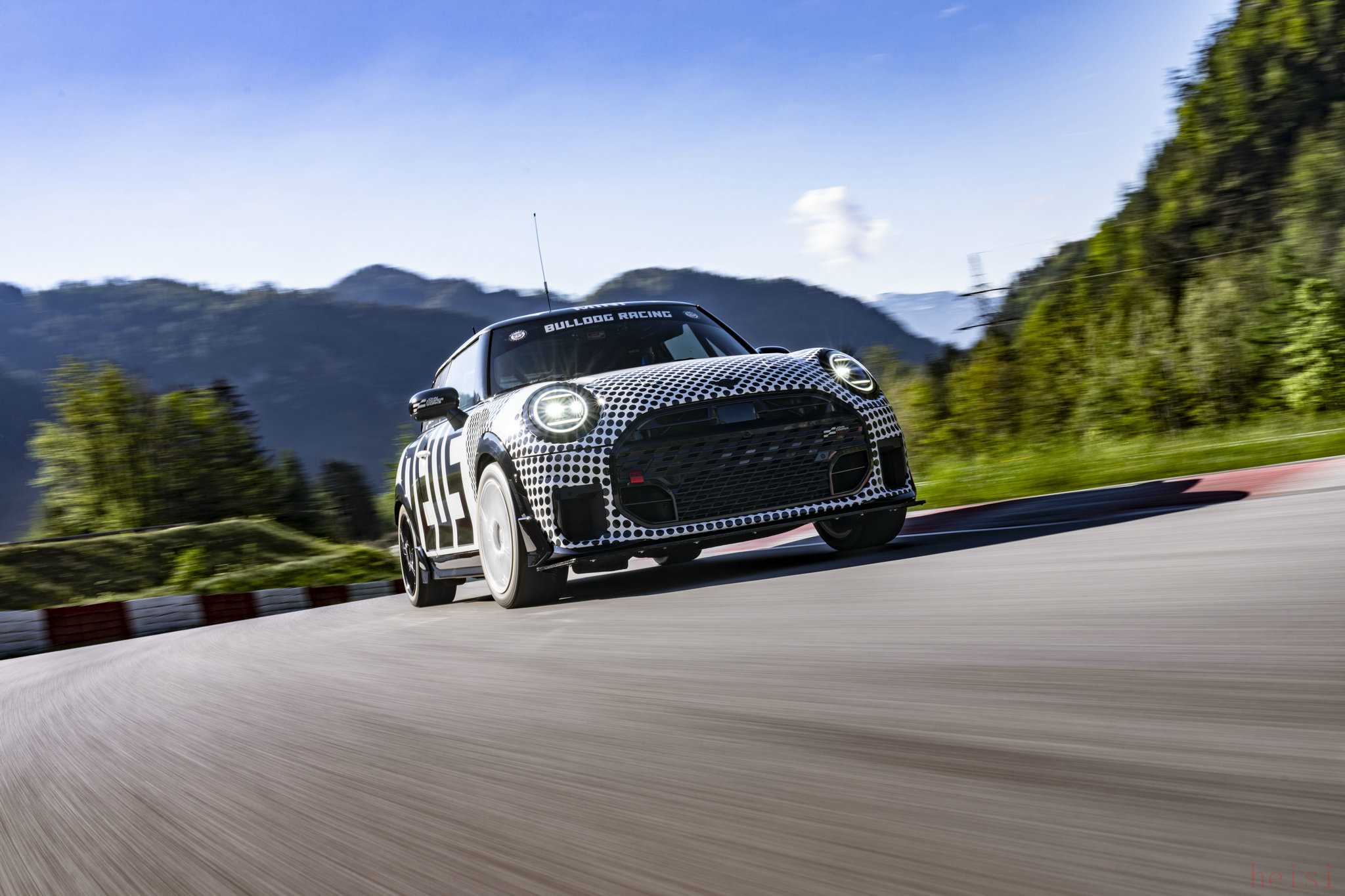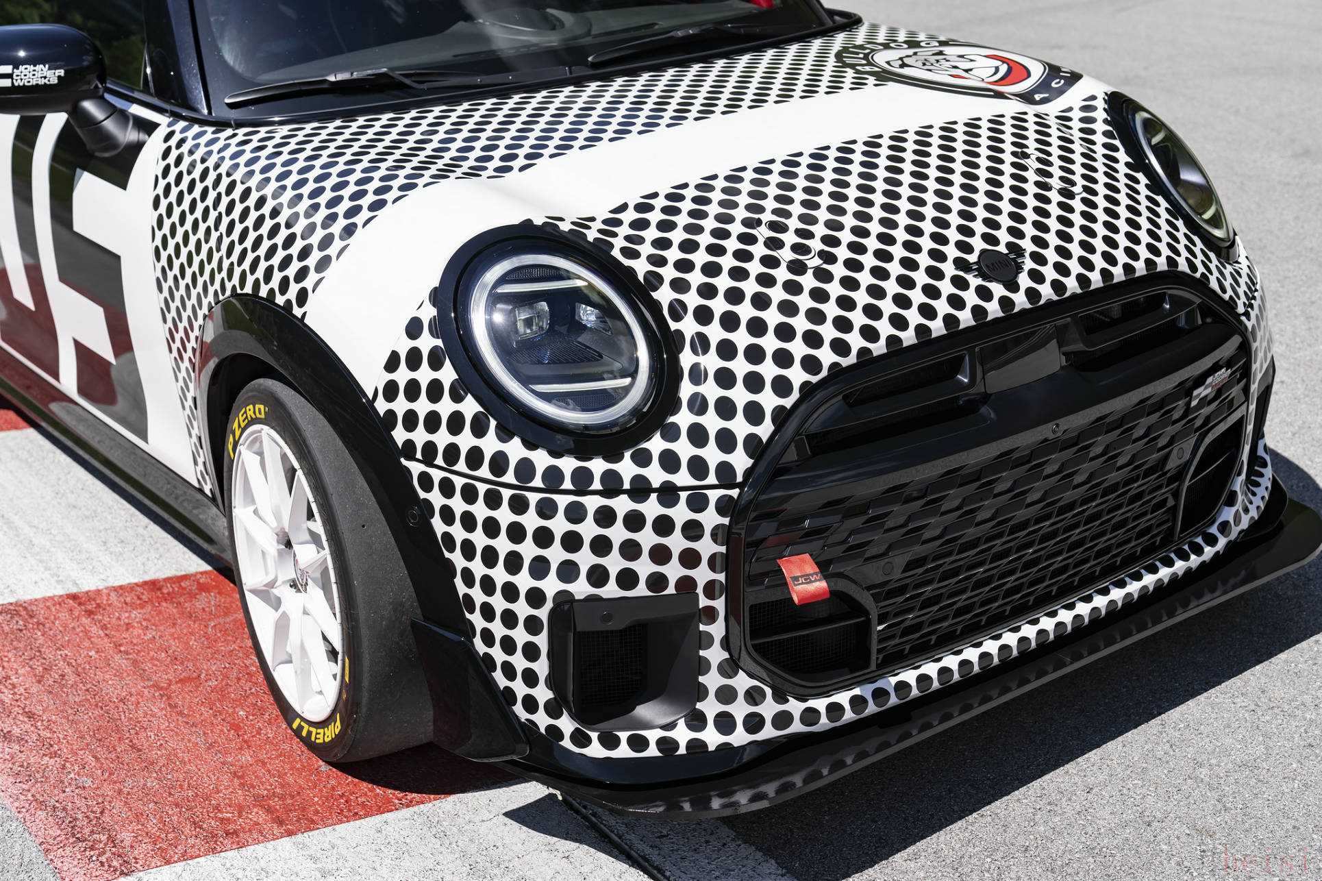此次參加紐博格林24小時耐力賽的MINI JCW賽車采用了黑白為主色調(diào),車頭部分帶有白底黑色波點,發(fā)動機艙蓋位置配有橫向白色飾條以及Bulldog Racing(斗牛犬賽車隊)的標(biāo)識。橫向白色飾條用于致敬女性傳奇車手Pat Moss在郁金香拉力賽為MINI贏得了國際拉力賽首勝,該圖案此前曾在2022年的Pat Moss紀(jì)念版車型上首次使用。