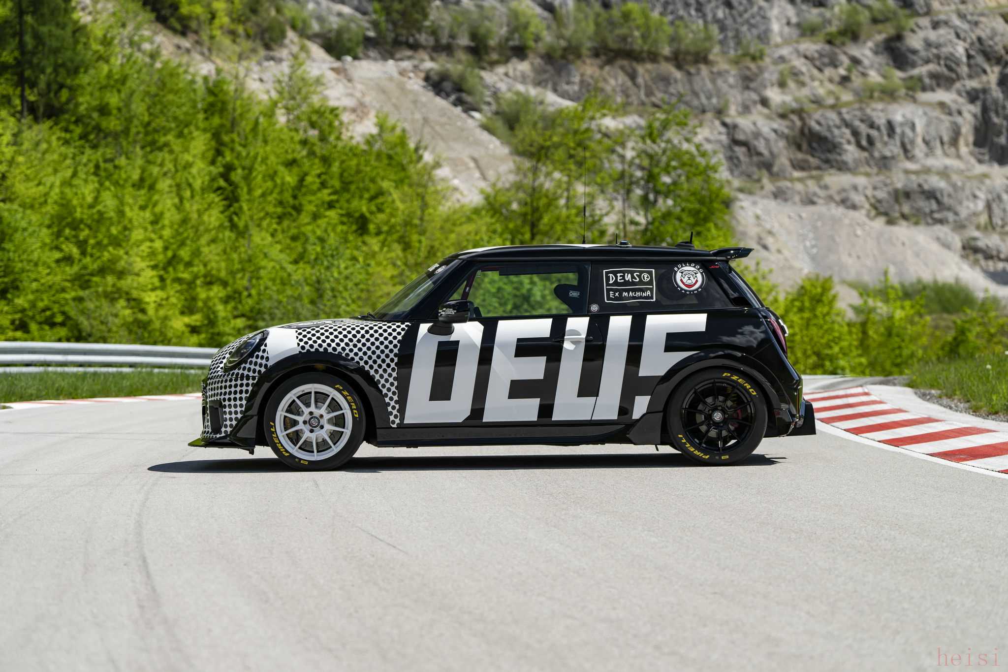 另外,全新MINI JCW賽車兩側(cè)分別應(yīng)用了黑底白字和白底黑字呈現(xiàn)了“DEUS”的品牌標(biāo)識。頂部和尾部分別帶有巨大的“X”以及“MINI”圖案,后尾窗還配備“Deus Ex Machina”拉花,前風(fēng)擋、后側(cè)窗等位置則設(shè)計有Bulldog Racing車隊標(biāo)識,輪輞也采用了前白后黑的搭配。