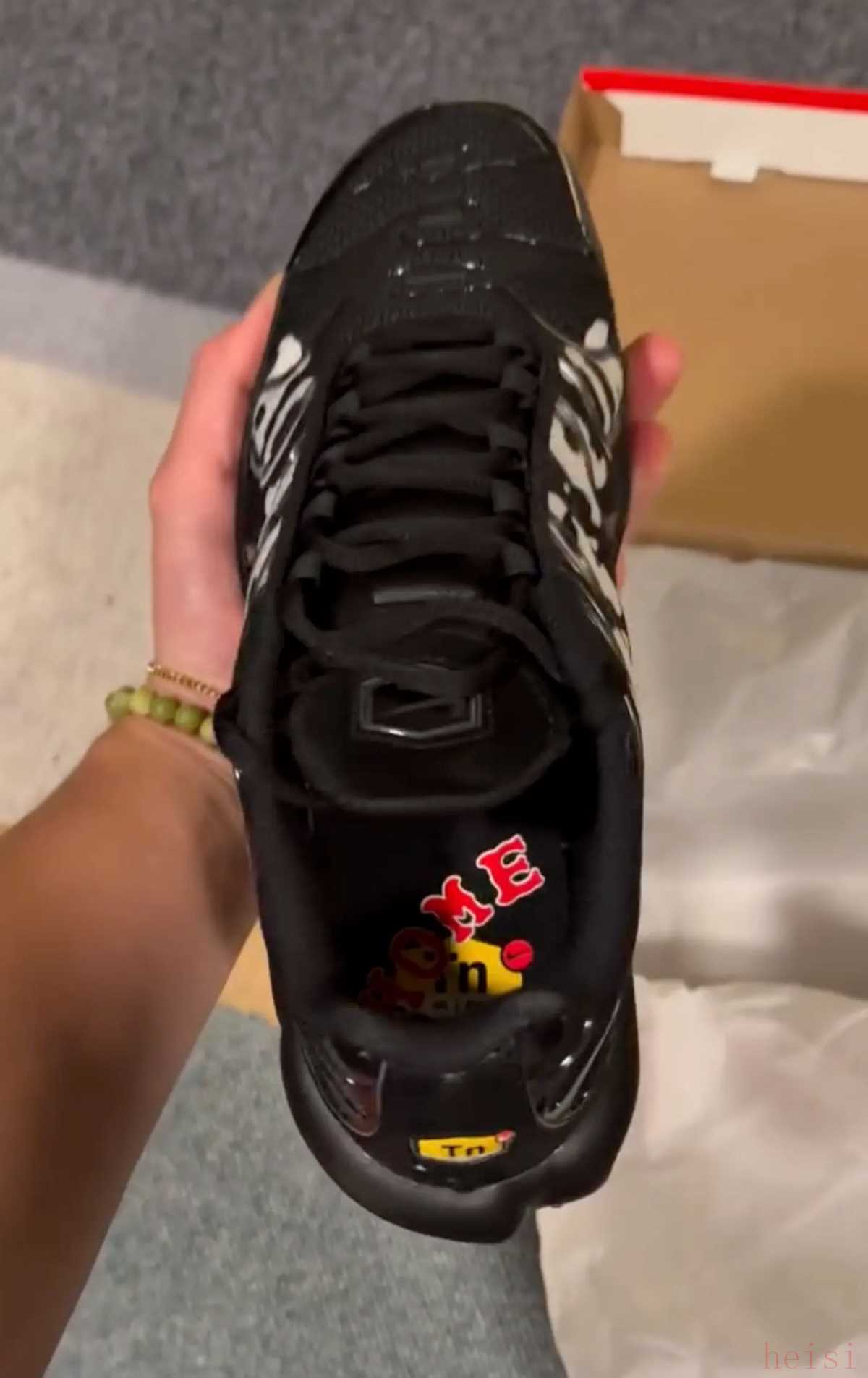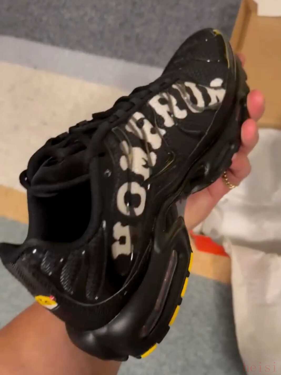 鞋型選擇了 Air Max Plus,兩側(cè)融入印有涂鴉風(fēng)格的 HOMERUN NYC 品牌字樣,整雙鞋保持了極簡(jiǎn)的配色方案,同時(shí)區(qū)別于 Nike 的常規(guī)款。