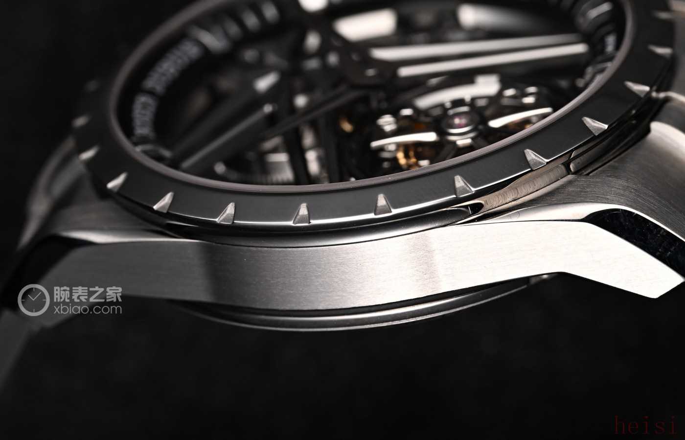 整枚腕表沒有任何夸張的顏色,就是簡單的黑色與灰色的結(jié)合,沒有絲毫影響讀時,再加上大面積的鏤空,并搭配上低調(diào)的鈦金屬光澤,但是就是用這種極致的簡單來詮釋了最高級的美學(xué),這也是我如此喜歡的原因之一。