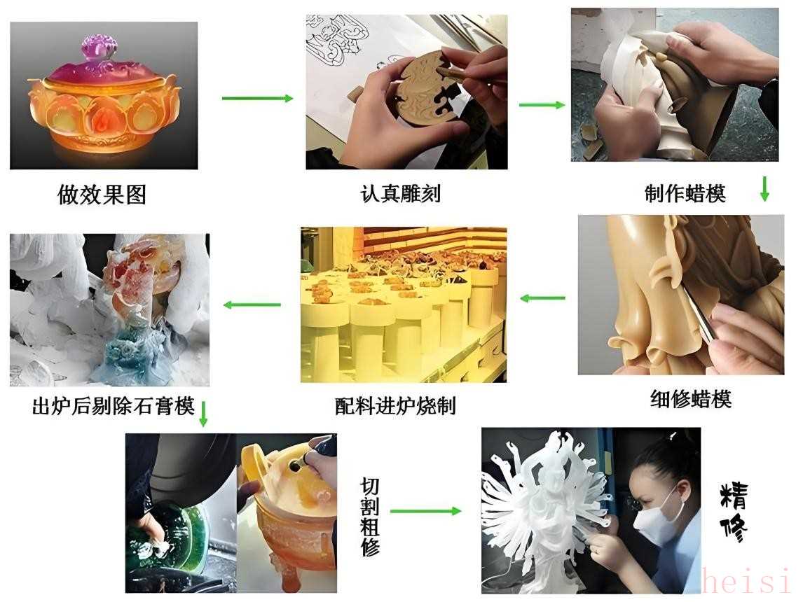 多次精密翻模后,將水晶琉璃母石置于 1000 多度高溫熔爐中熔化塑形 。在這個(gè)過程中,高溫的熔爐仿佛是一個(gè)神秘的魔法空間,水晶琉璃母石在其中經(jīng)歷著從固態(tài)到液態(tài)的奇妙轉(zhuǎn)變。匠人們緊緊盯著熔爐,根據(jù)火焰的顏色、溫度的變化,適時(shí)調(diào)整火候,確保琉璃能夠完美地流入模具,呈現(xiàn)出理想的形狀 。