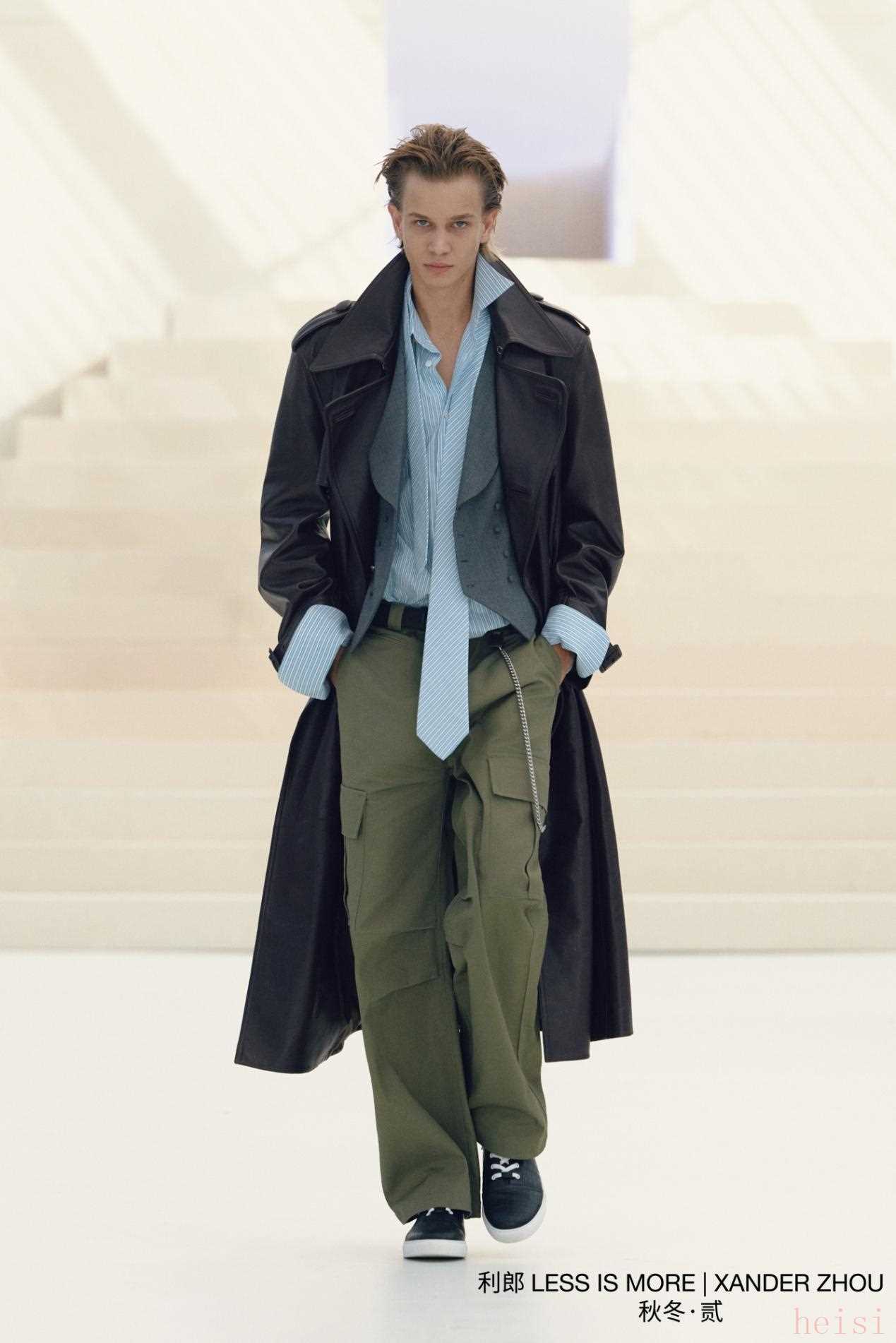 “沒有為了‘設計’而設計,更關心的是,這些服裝如何豐富地表達出都市男性在現(xiàn)實中的多重狀態(tài)?!痹凇窮rom Stone to Structure|由石至形」系列中,設計師周翔宇XANDER ZHOU并未追求形式上的設計,而是更聚焦于服裝如何呈現(xiàn)都市男性的多元形象。其將跨文化視覺與對男裝體系的當代解讀融入設計邏輯中,并轉化為對服裝輪廓、比例、材質的表達。西裝、大衣、皮革襯衫與針織層疊構成了“理性衣櫥”的骨架,比例與結構之間形成自洽的秩序感。
