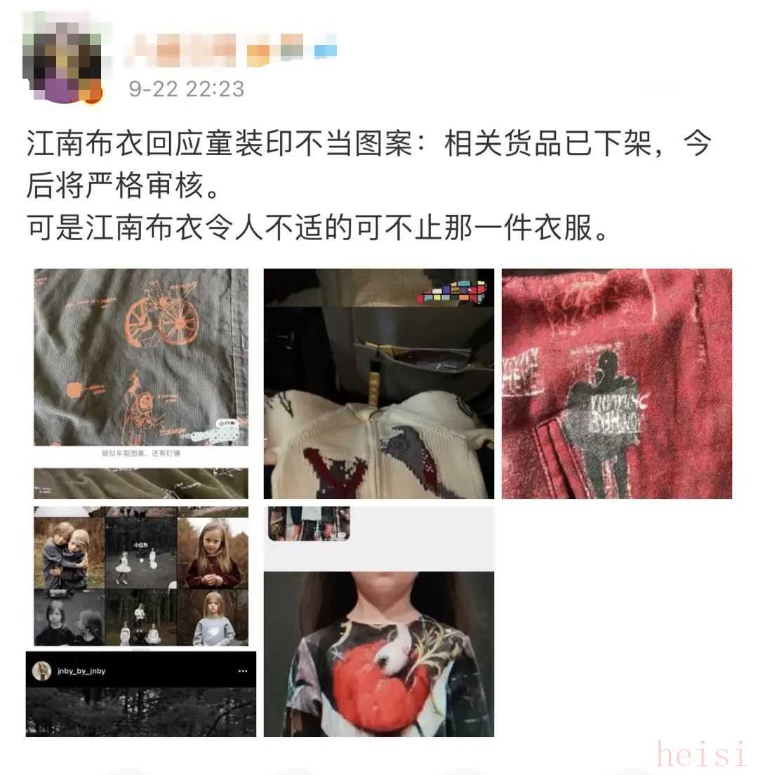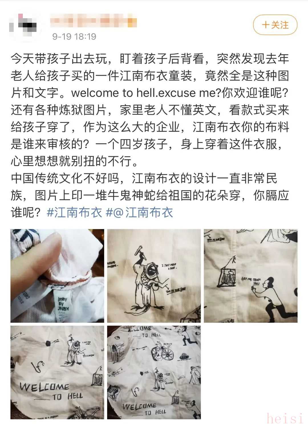 9月19日,一網(wǎng)友在社交平臺發(fā)文稱,她是一位4歲孩子的母親,發(fā)現(xiàn)給孩子買的江南布衣童裝上印有不恰當(dāng)?shù)闹T如撒旦、肢體等詭異圖案及不合時(shí)宜的英文,如“welcome to the hell(歡迎來到地獄)”“l(fā)et me touch you(讓我摸摸你)”等,引起熱議。