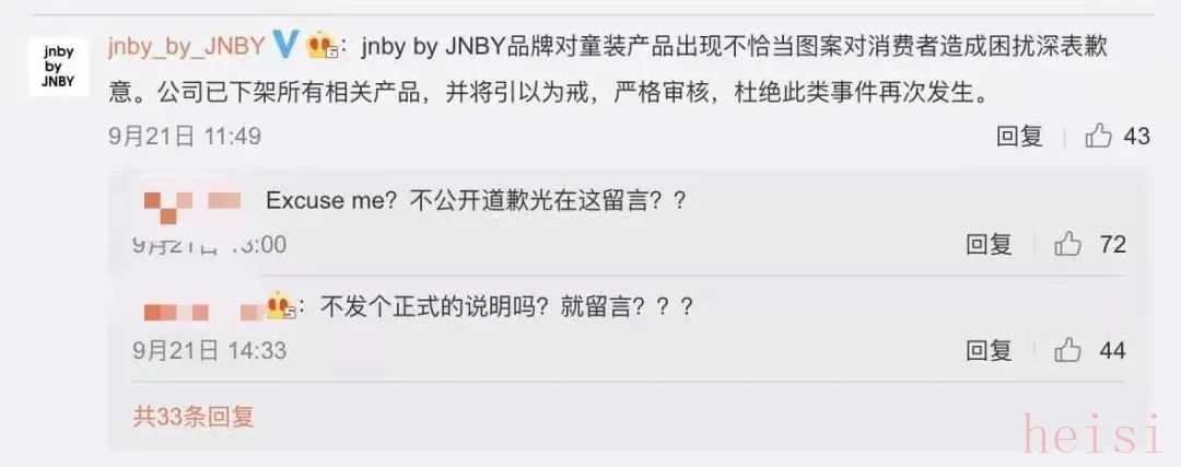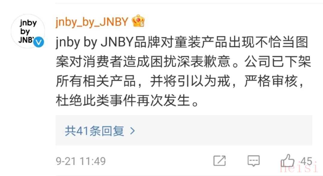 9月21日,面對質(zhì)疑,涉事童裝的設(shè)計(jì)師品牌“jnby by JNBY”在該網(wǎng)友的質(zhì)疑微博下道歉,稱對童裝產(chǎn)品出現(xiàn)不恰當(dāng)圖案對消費(fèi)者造成困擾深表歉意。公司已下架所有相關(guān)產(chǎn)品,并引以為戒,嚴(yán)格審核,杜絕此類事件再次發(fā)生。