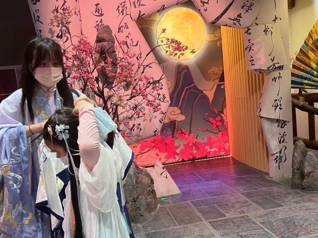 2022年10月30日下午2點,在沉浸式主題商業(yè)空間“戲精桃花源”入口處的服裝店外,NPC(非玩家角色工作人員) 幫小朋友換上漢服,整理發(fā)飾。新京報記者 楊柳 攝