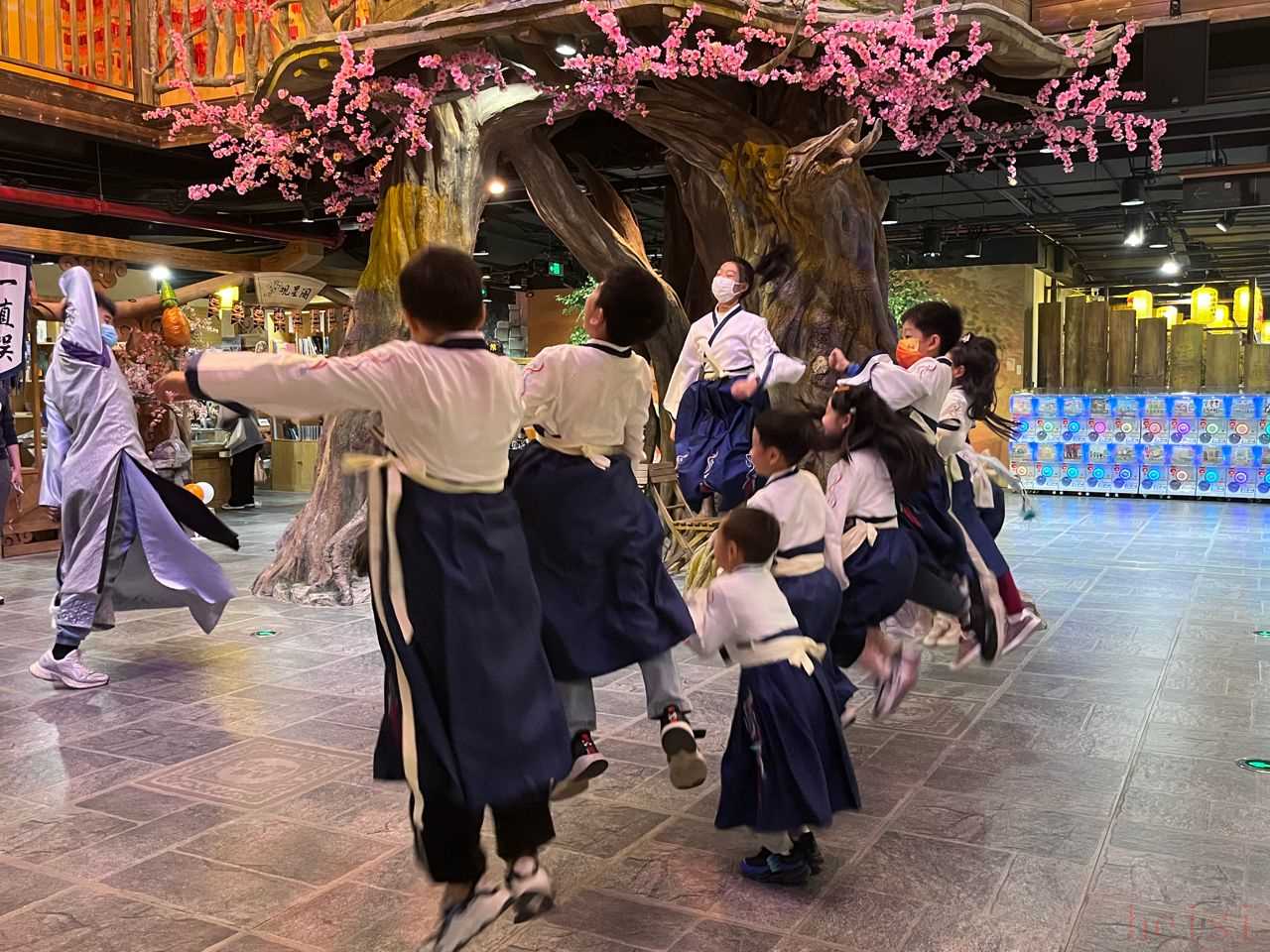 誦讀聲縈繞耳際,6歲的男孩阿喜好奇地偷偷睜開眼,兩個按捺不住的男孩跑到樹洞下的木桌旁,穿著胭粉色漢服長裙的女性NPC(非玩家角色工作人員)見狀趕緊上前,提醒孩子們站好閉眼。