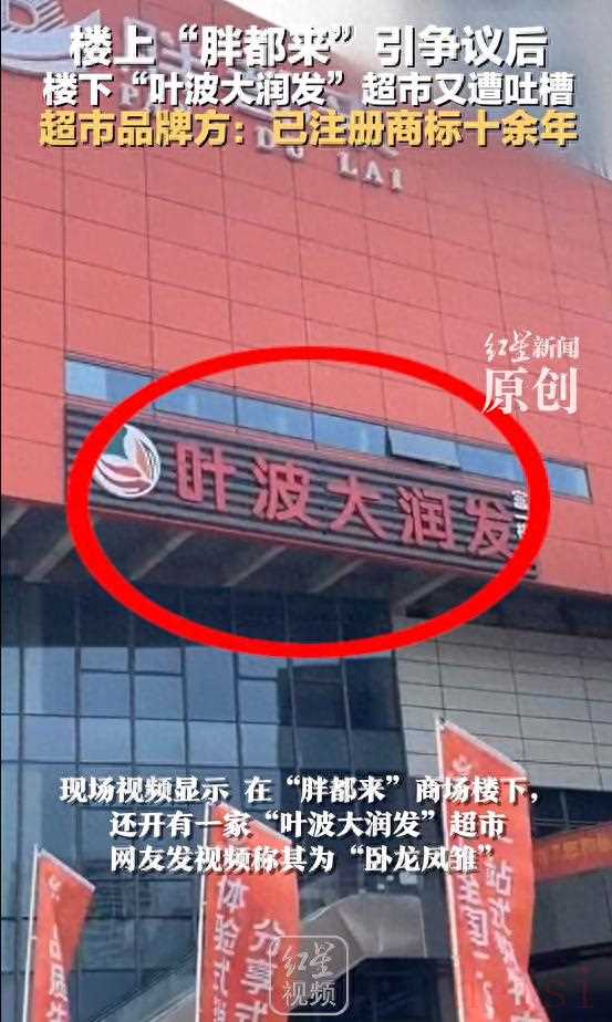 近日 ,浙江海寧市“胖都來”服飾商場開業(yè)陷入了品牌名稱爭議風(fēng)波。現(xiàn)場視頻顯示 ,在“胖都來”商場樓下,還開有一家“葉波大潤發(fā)”超市,網(wǎng)友發(fā)視頻稱其為“臥龍鳳雛”,質(zhì)疑超市名字與知名零售品牌“大潤發(fā)”相似。