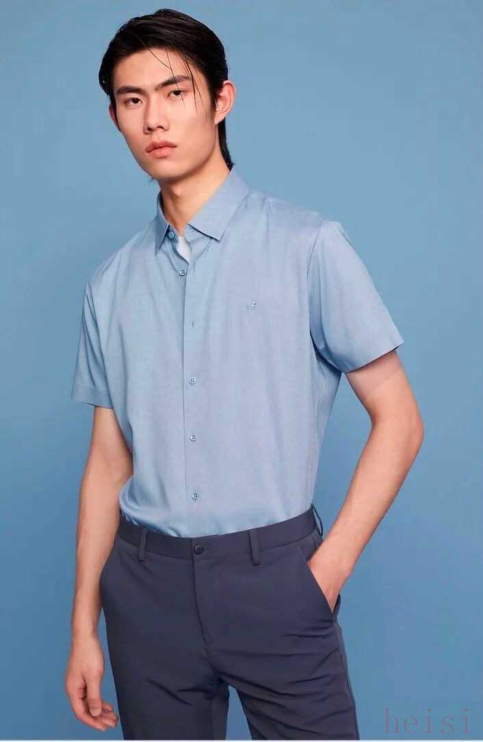 藍(lán)色的短袖襯衫也是同樣的道理。不過呢,比起這樣搭一條商務(wù)感滿滿的褲子,不妨試一試更加休閑的牛仔褲,能夠瞬間化解搭配的老氣哦。這種褲子就留給需要展示你的沉穩(wěn)的工作場合吧。