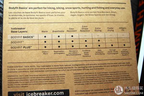 盒子的背面,有尺碼表和相關(guān)說明,是全英文的,如果在國內(nèi)銷售的話是不是要貼上中文說明比較好?上面說明了Bodyfit Basics系列不僅適用于徒步、騎自行車、雪上運動、狩獵和釣魚等運動,同樣適合于日常的穿著。