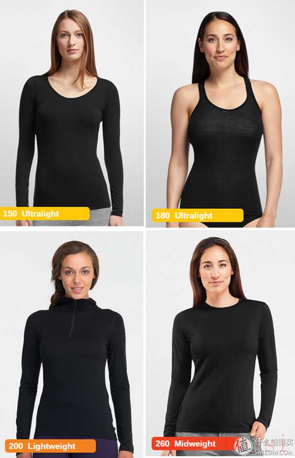 Icebreaker的系列產(chǎn)品包括Bodyfit、MerinoLOFT、Icebreaker GT、Cool-Lite等系列,這次我試穿的就是屬于Bodyfit系列中的產(chǎn)品。購買時要注意磅數(shù)的選擇,比如下面這四件衣服,雖然都是黑色,看上去款式也很類似,但實際上磅數(shù)從150到260不等,保暖的效果自然也是不一樣的。