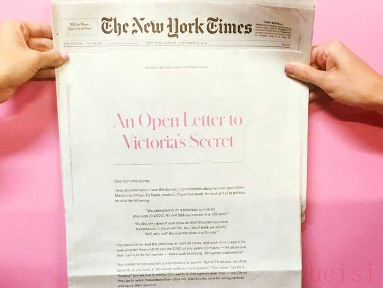 Third Love買下《紐約時(shí)報(bào)》整個(gè)版面發(fā)了一封“致維密公開信”,表示,“你們的節(jié)目可能是場(chǎng)‘幻想’,但我們生活在現(xiàn)實(shí)里。我們的現(xiàn)實(shí)是,女人在日常工作、帶孩子、運(yùn)動(dòng)、照顧雙親,甚至是為國(guó)家服務(wù)的時(shí)候需要穿胸罩。”