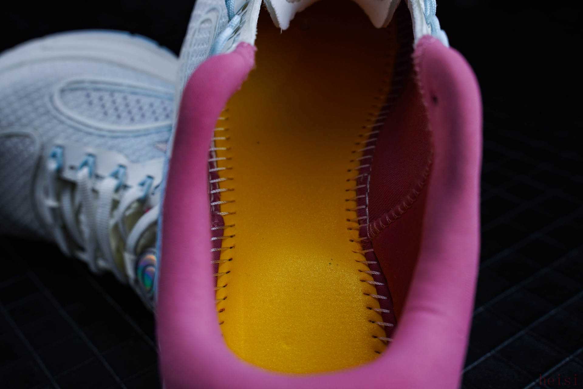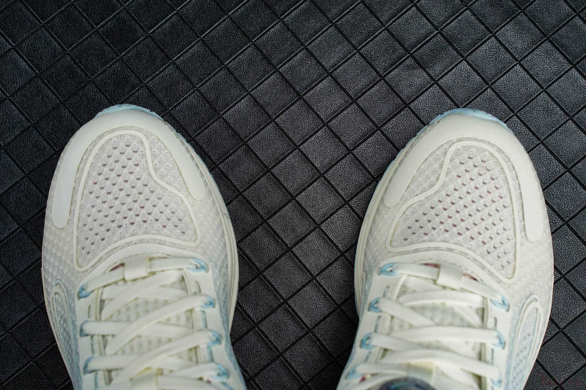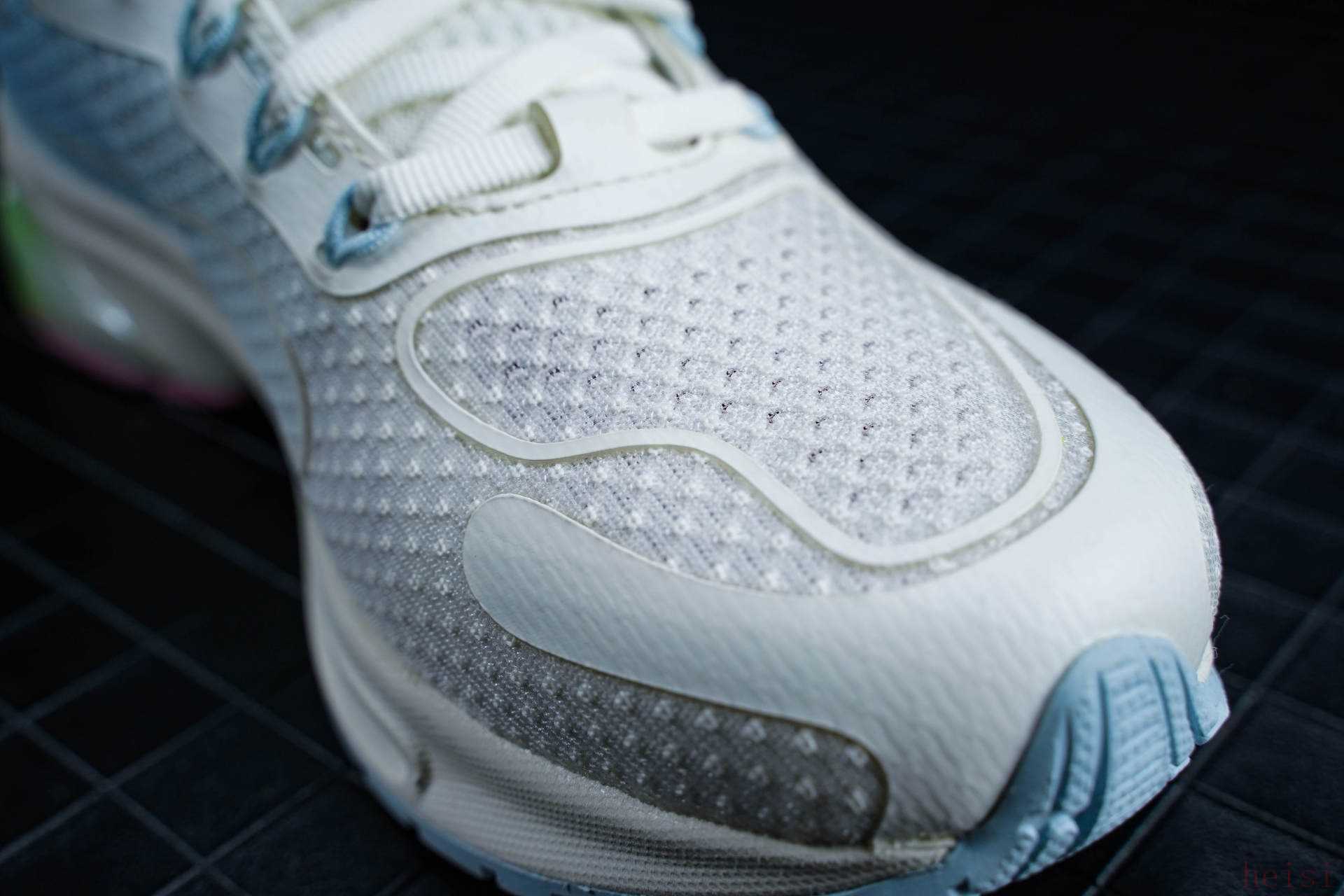 那么我們一起看看安踏運動品牌究竟怎樣吧!首先今天出席的是安踏跑鞋系列,顏色是象牙白/淺明藍它是一款女士跑鞋,面料是針織材質編織而成的。