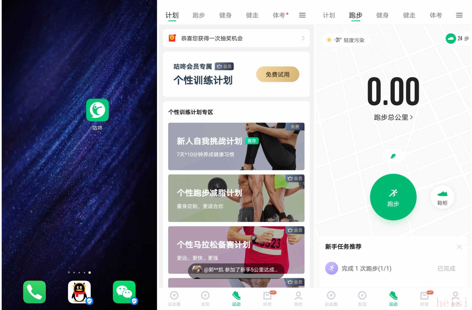 鞋子,給人的感覺比較單調。而搭配上只能穿戴的咕咚跑步精靈,讓枯燥的跑步就更加富有樂趣。當手機下載好咕咚APP并且注冊好之后,里面的東西還是非常豐富的,有著各種的計劃,對于不用目的健身的人群制定新人計劃,跑步減脂計劃,馬拉松計劃,讓我們能夠更加科學的,有效的來規(guī)劃我們的運動生活。