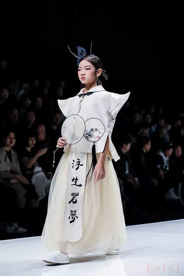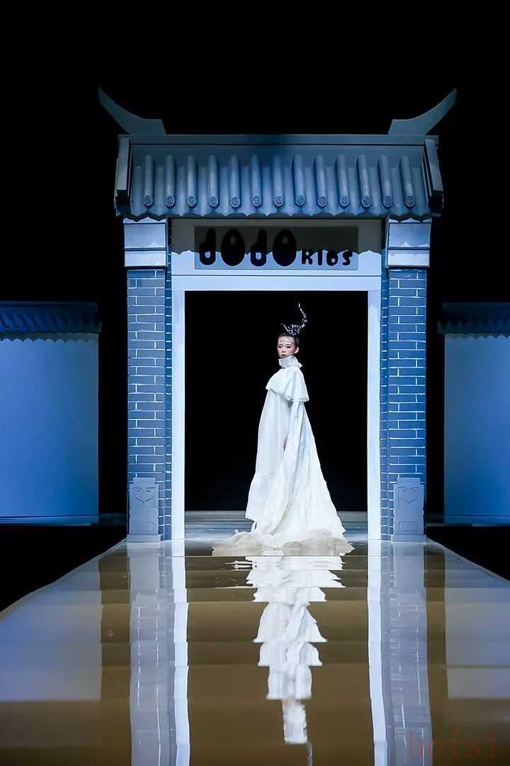整個T臺秀仿佛是一幅徐徐展開的水墨長卷。從秀場的布置到模特的走動,再到服裝本身的設(shè)計,無不透露出濃厚的藝術(shù)氣息:
