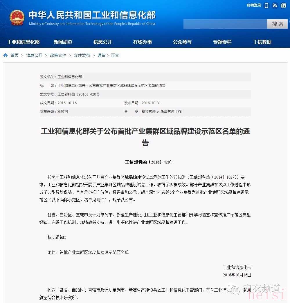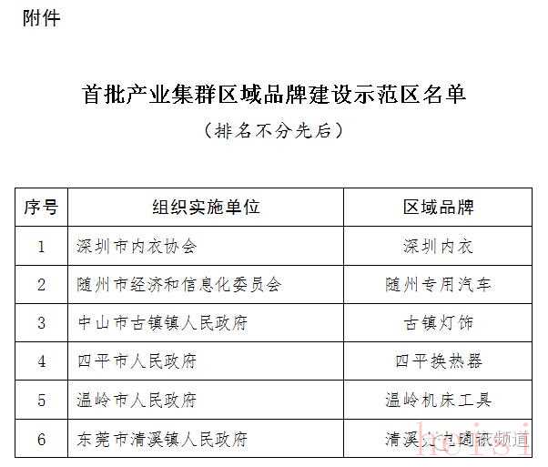 近日 工信部公布了全國首批產(chǎn)業(yè)集群區(qū)域品牌建設(shè)示范區(qū)名單 深圳內(nèi)衣 攜手隨州專用汽車、古鎮(zhèn)燈飾、四平換熱器、溫嶺機(jī)床工具、清溪光電通訊等6個(gè)產(chǎn)業(yè)集群榮登榜單。