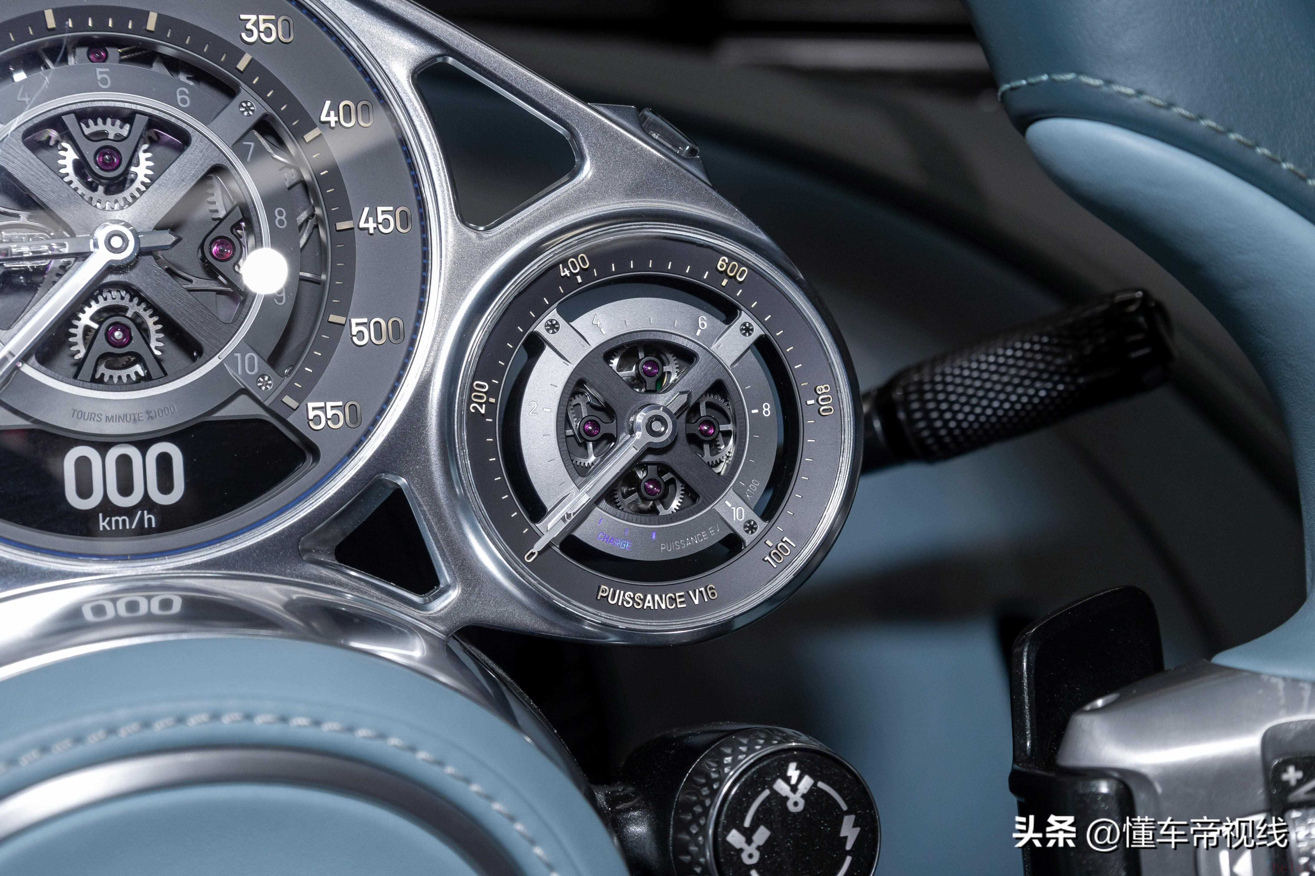 Tourbillon還搭載了一款全新樣式的儀表,表盤主體并非傳統(tǒng)的內(nèi)嵌式設(shè)計(jì),而是采用了類似于懸浮式的布置形式,同時(shí)取消了遮陽(yáng)板。儀表由三個(gè)圓形表盤組合而成,表底運(yùn)用了類似于腕表的鏤空樣式,視覺(jué)效果很有機(jī)械感。左側(cè)儀表內(nèi)部則設(shè)計(jì)有三個(gè)小表盤,位于中間的表盤則為車速表。