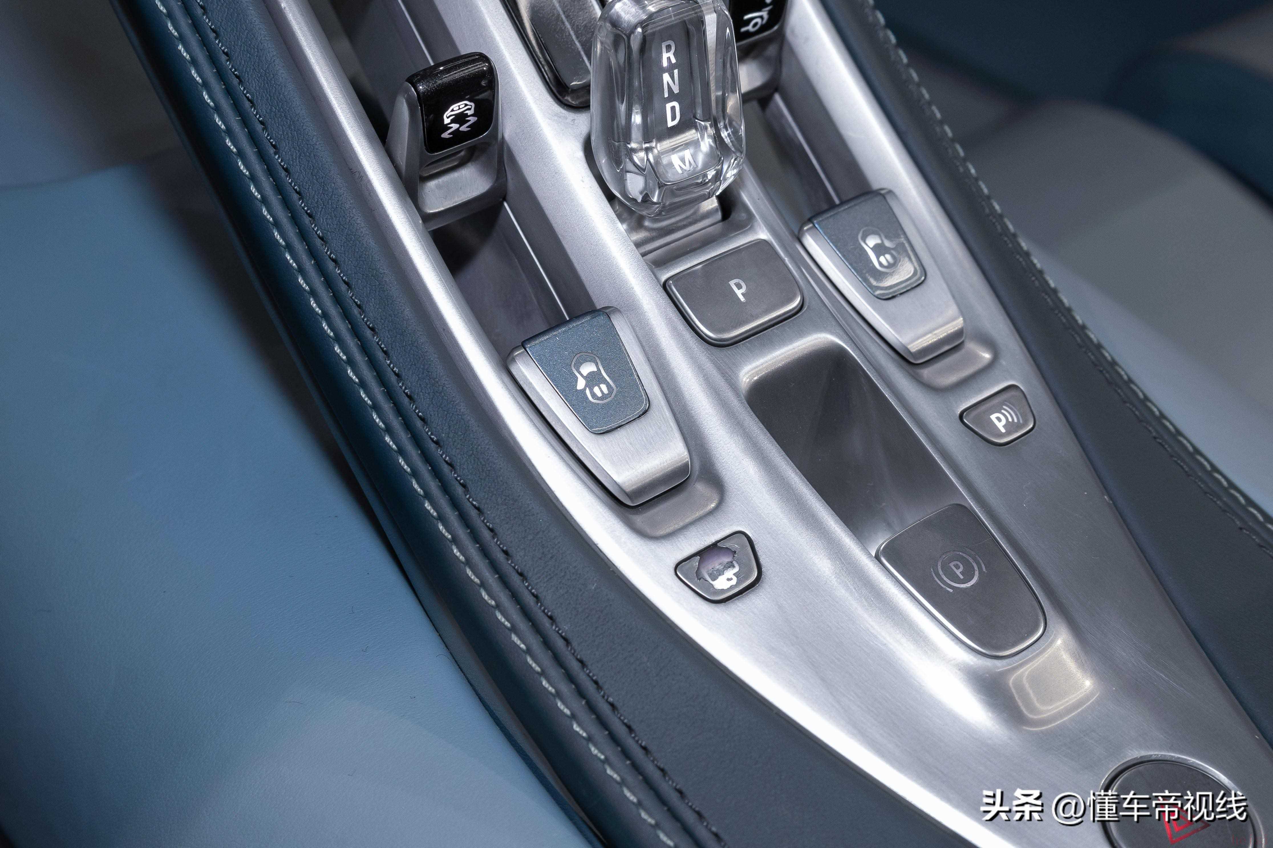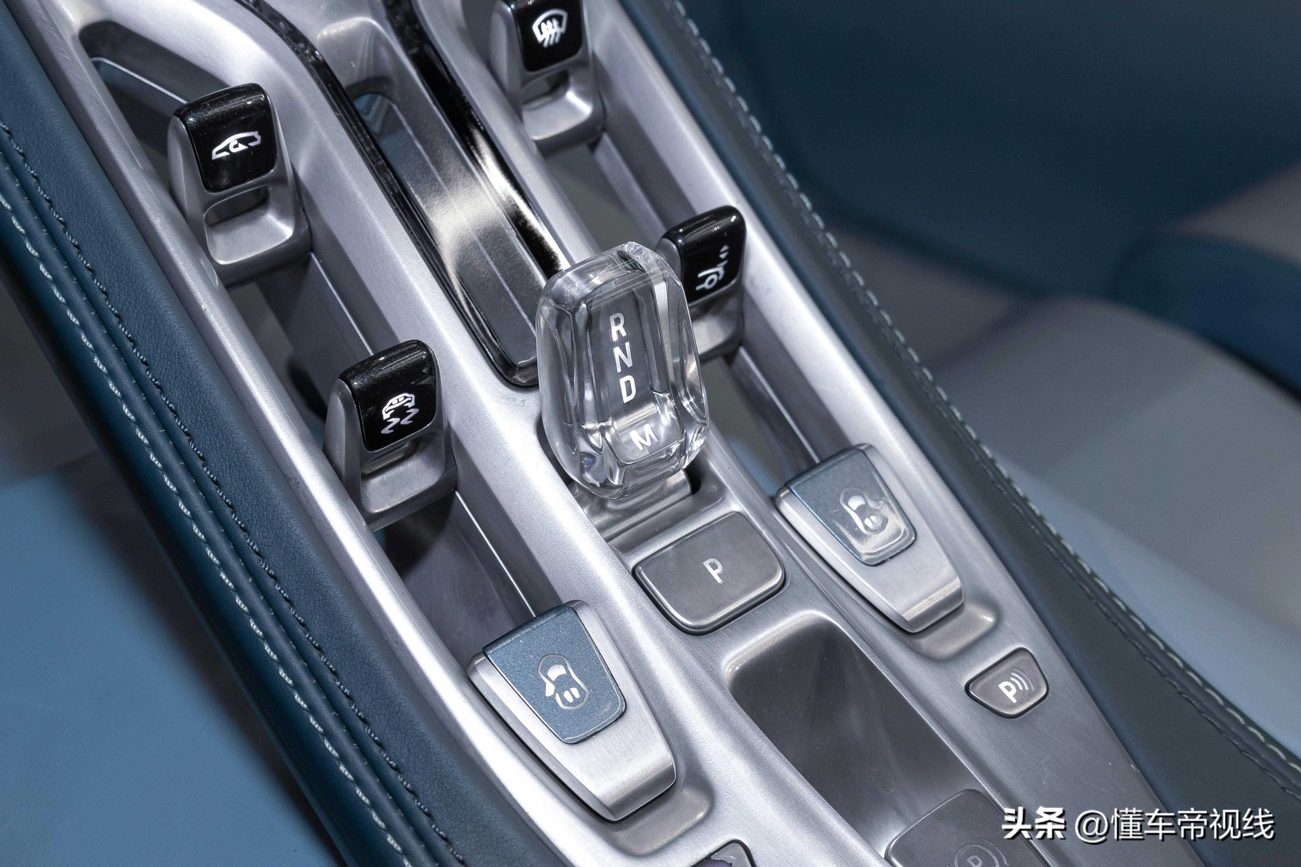 副儀表臺(tái)處保留了諸多的物理按鍵、旋鈕和撥桿,包括音響和空調(diào)系統(tǒng)的控制旋鈕,換擋撥桿則采用水晶材質(zhì)打造,且造型非常小巧,控制車門的按鍵布置在了換擋撥桿的下方。