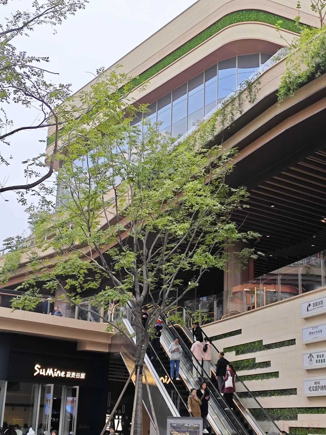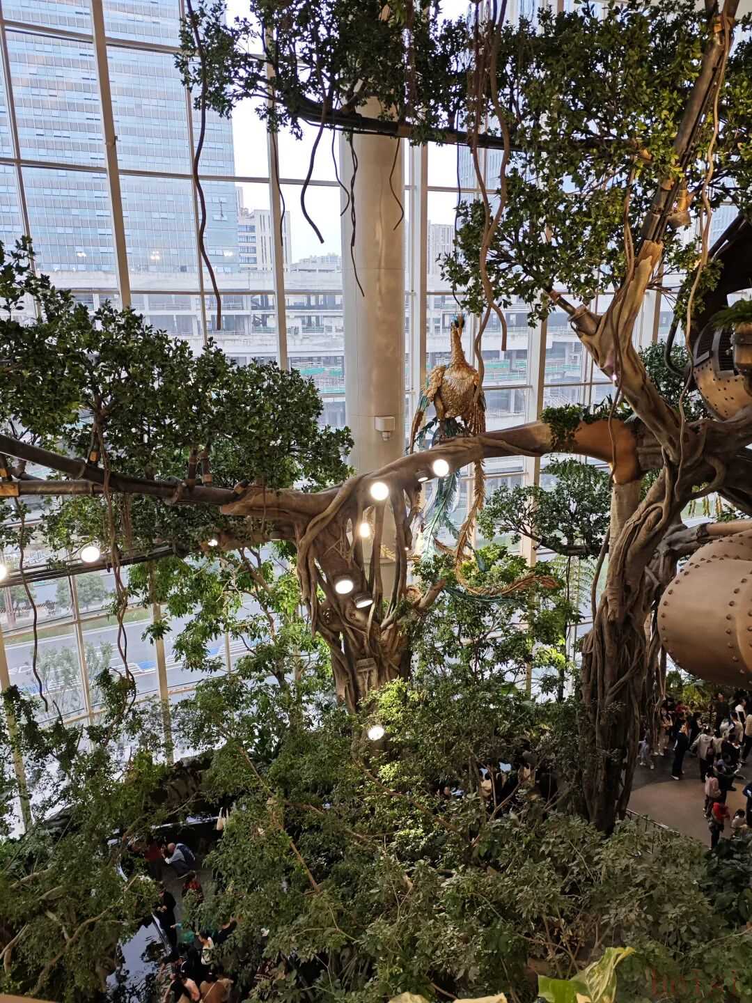 從外部坐電梯向上,眼前是商業(yè)體的大面積綠植,轉(zhuǎn)頭回望,是正對(duì)面綠意盎然的中央公園,這種感覺挺好。光環(huán)花園城打造了一個(gè)“超級(jí)場(chǎng)景”——“世界樹”,高約20米,融合機(jī)械與植物,營(yíng)造出賽博朋克風(fēng)的未來森林。