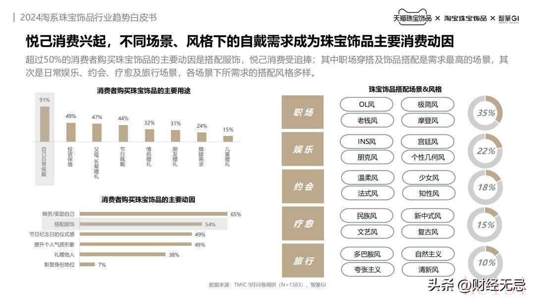 在周大福直播間買金的她,就是為了尋找秋冬的氛圍感神器?!?024淘系珠寶飾品趨勢白皮書》也顯示,在人們購買珠寶飾品的主要?jiǎng)右蛑?,?4%是為了搭配服飾。