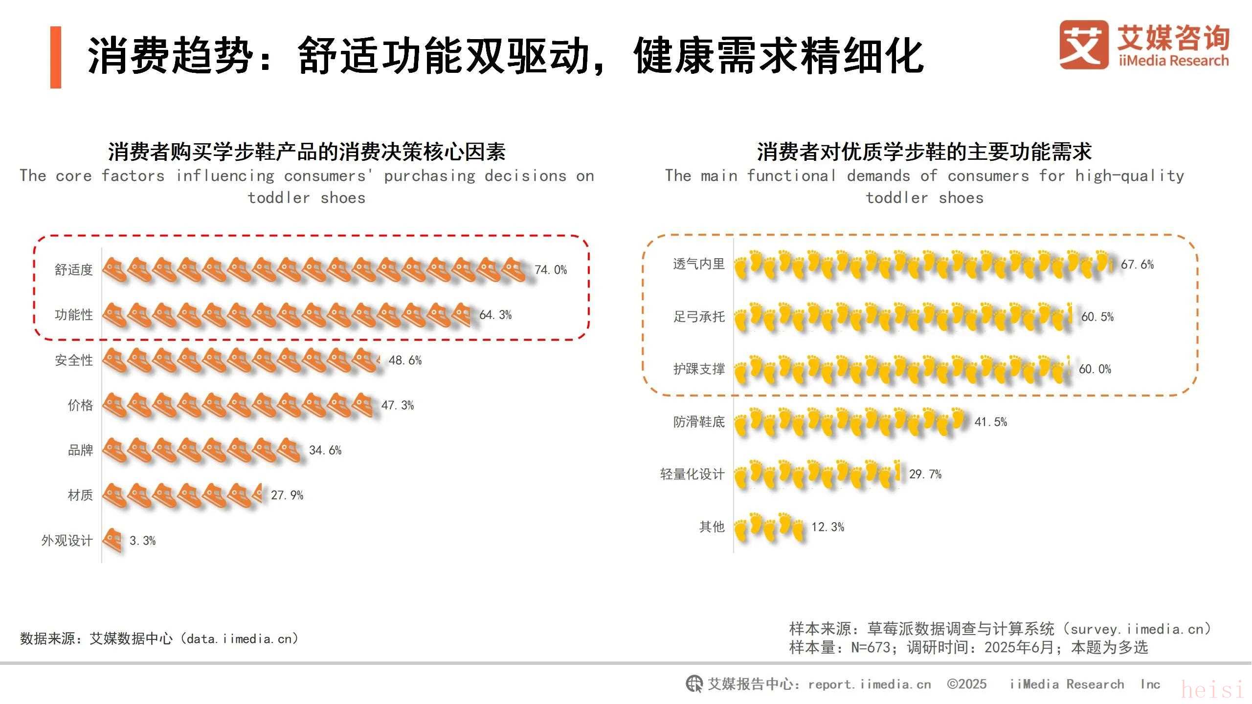 隨著科學育兒理念的普及與消費升級,家長對學步鞋的需求從“基礎保護”向“專業(yè)護足”升級,推動市場加速向專業(yè)化、精細化轉型——產品創(chuàng)新(如3D足部掃描、智能傳感監(jiān)測、抗菌環(huán)保材料應用)成為核心驅動力,行業(yè)前景持續(xù)擴容。這一趨勢為卡特兔等專業(yè)兒童鞋品牌提供了廣闊的發(fā)展空間,卡特兔憑借其在童鞋領域的專業(yè)研發(fā)和創(chuàng)新設計,精準把握市場需求,引領了學步鞋市場的增長潮流。 基于艾媒自主研發(fā)并獲得省部級重大科技專項立項的CMDAS大數據系統(tǒng)監(jiān)測及嚴格的調查,以及對中國(不含港澳臺)學步鞋、健康鞋市場研究比對的結果進行統(tǒng)計確認,卡特兔獲全球領先的新經濟產業(yè)第三方數據挖掘和分析機構iiMedia Research(艾媒咨詢)授予的“中國K盾防護型學步鞋開創(chuàng)者”“兒童成長健康鞋領導者”“學步鞋連續(xù)3年全網銷量第一”共三項市場地位確認。 iiMedia Research(艾媒咨詢)是全球領先的新經濟產業(yè)數據挖掘與分析機構,以自主研發(fā)的CMDAS大數據監(jiān)測系統(tǒng)(省部級重大科技專項,項目編號:2016B010110001)和AI智能分析引擎為核心,構建了覆蓋135個國家和地區(qū)、10000+行業(yè)細分領域的全球實時數據網絡,監(jiān)測3000余項核心商業(yè)指標,打造新經濟產業(yè)的“數據氣象局”。 艾媒咨詢深度洞察行業(yè)前沿領域,以“全球產業(yè)數據庫+AI算法”雙輪驅動,為企業(yè)提供精準市場洞察與戰(zhàn)略支持,賦能全球化增長。旗下iiMedia Ranking(艾媒金榜)通過iiMeval大數據評價模型,為新消費品牌提供權威評估與消費指南,引領行業(yè)標準。 在兒童學步鞋行業(yè)中,產品創(chuàng)新是驅動其增長的關鍵引擎。隨著科技與材料的不斷進步,學步鞋在設計、功能與材質上持續(xù)突破。自2014年創(chuàng)立以來,卡特兔品牌始終秉持“科學守護孩子足部自然發(fā)育”的理念,構建“產-研-醫(yī)”協(xié)同研發(fā)體系,圍繞0-12歲兒童多階段成長需求,打造覆蓋學步初期、穩(wěn)步期、過渡期的全周期專業(yè)童鞋產品矩陣。 iiMedia Research(艾媒咨詢)數據顯示,在學步鞋購買決策中,舒適度(74.0%)和功能性(64.3%)構成核心考量維度;在產品功能需求方面,透氣內里(67.6%)、足弓承托(60.5%)、護踝支撐(60.0%)成為主要訴求,反映出消費者對產品舒適性與足部健康保護功能的高度重視??ㄌ赝玫漠a品設計充分考慮了這些需求,其小K盾學步鞋采用獨特的護踝設計,為孩子的足部提供全方位的保護,深受消費者喜愛。