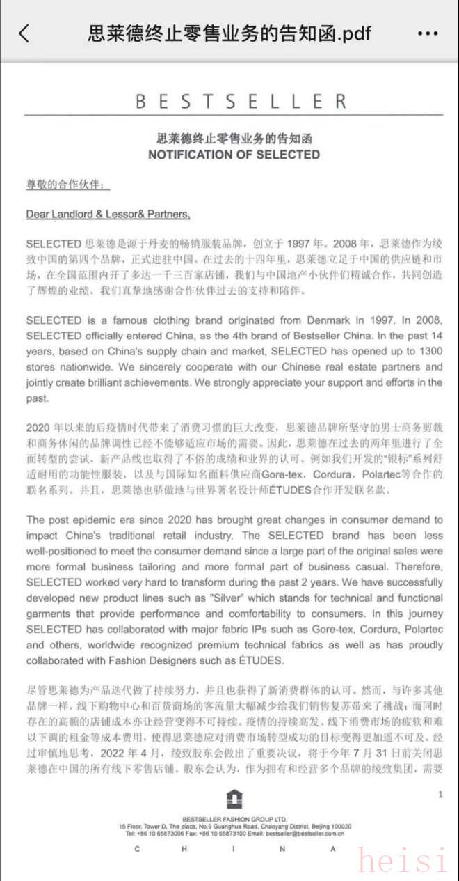 5月10日晚,一份有關(guān)綾致時(shí)裝旗下皮那批思萊德SELECTED品牌終止中國(guó)零售業(yè)務(wù)的通知文件在網(wǎng)上流傳。