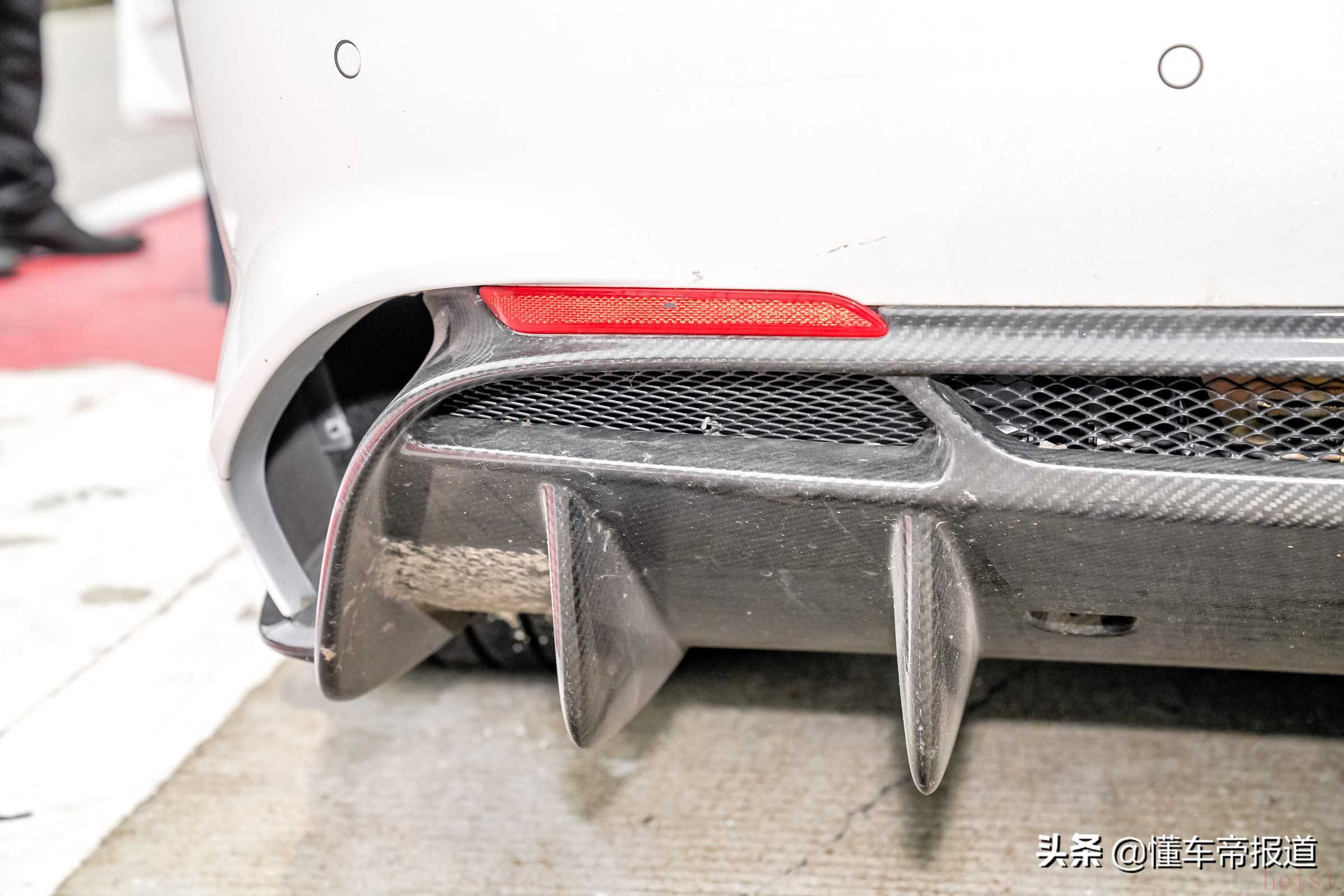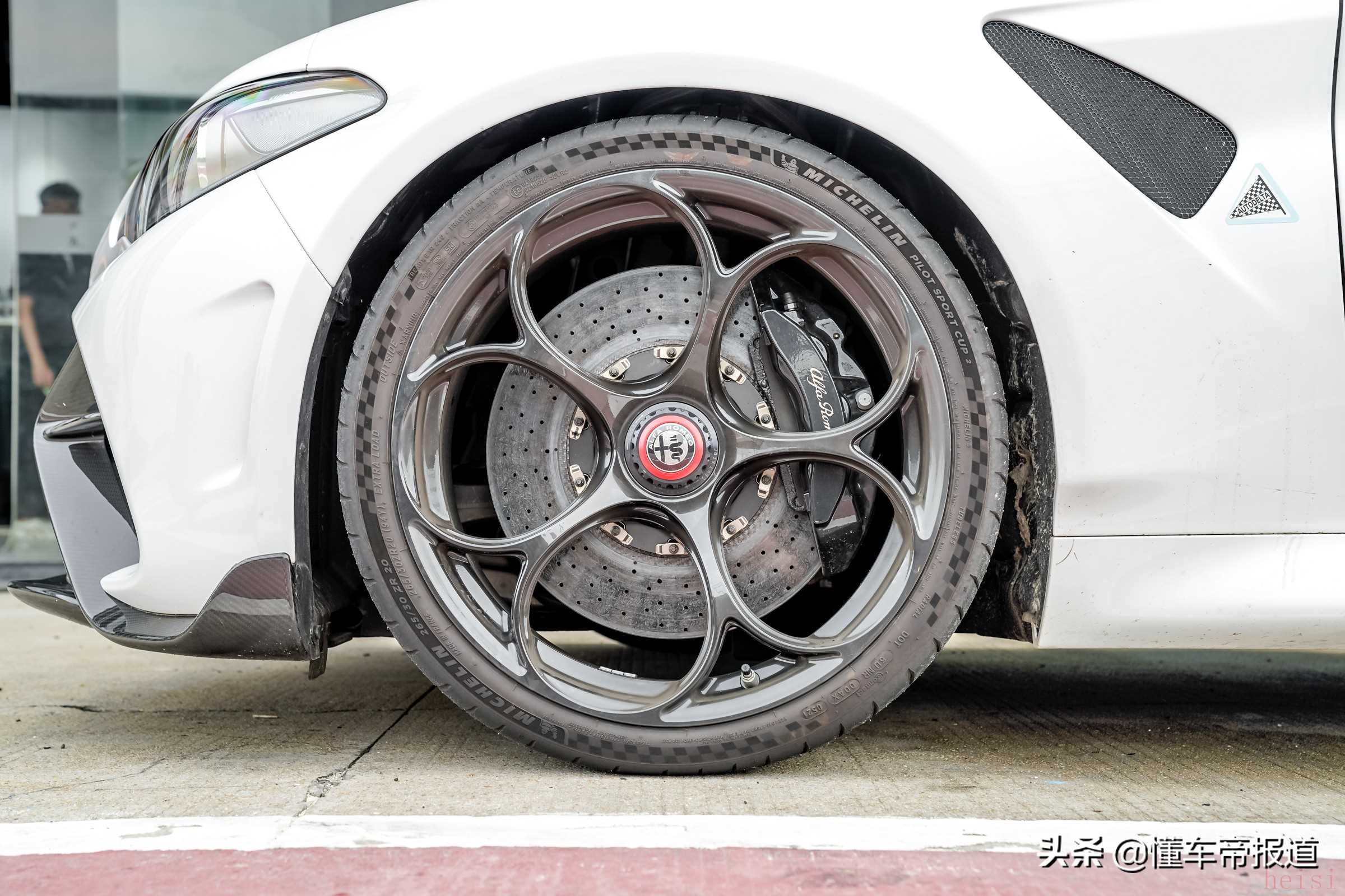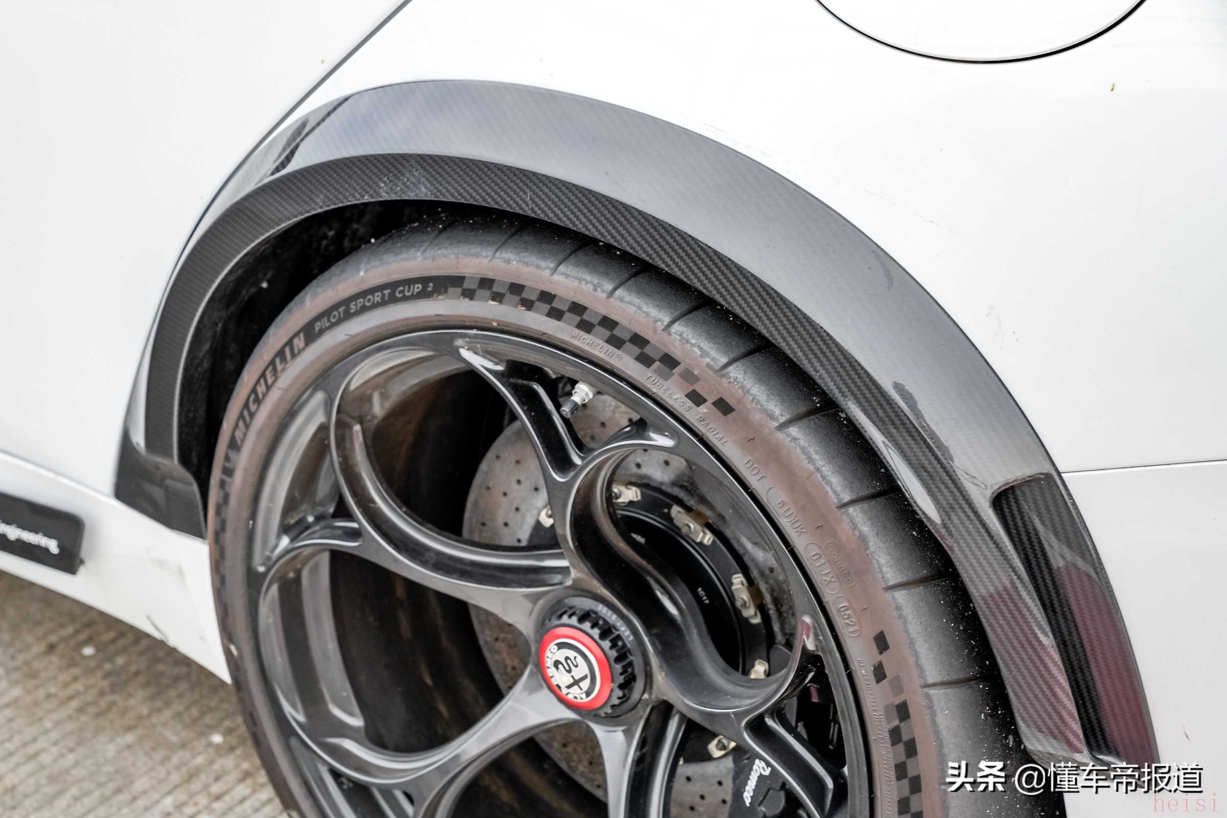 除材質(zhì)更加輕量化,這款車搭載了全新研發(fā)的空氣動(dòng)力學(xué)套件、定制化后擾流板以及全新主動(dòng)式前定風(fēng)翼,并且前保險(xiǎn)杠造型更加激進(jìn),后保險(xiǎn)杠下部也使用了碳纖維擴(kuò)散器,排氣升級(jí)為中置雙出口造型的天蝎(Akrapovi?)鈦合金排氣系統(tǒng)。從加寬的車身也能看出,Giulia GTA與Giulia GTAm前輪輪距較Giulia四葉草車型有所增加,其前輪輪距加寬25毫米、后輪輪距加寬50毫米。