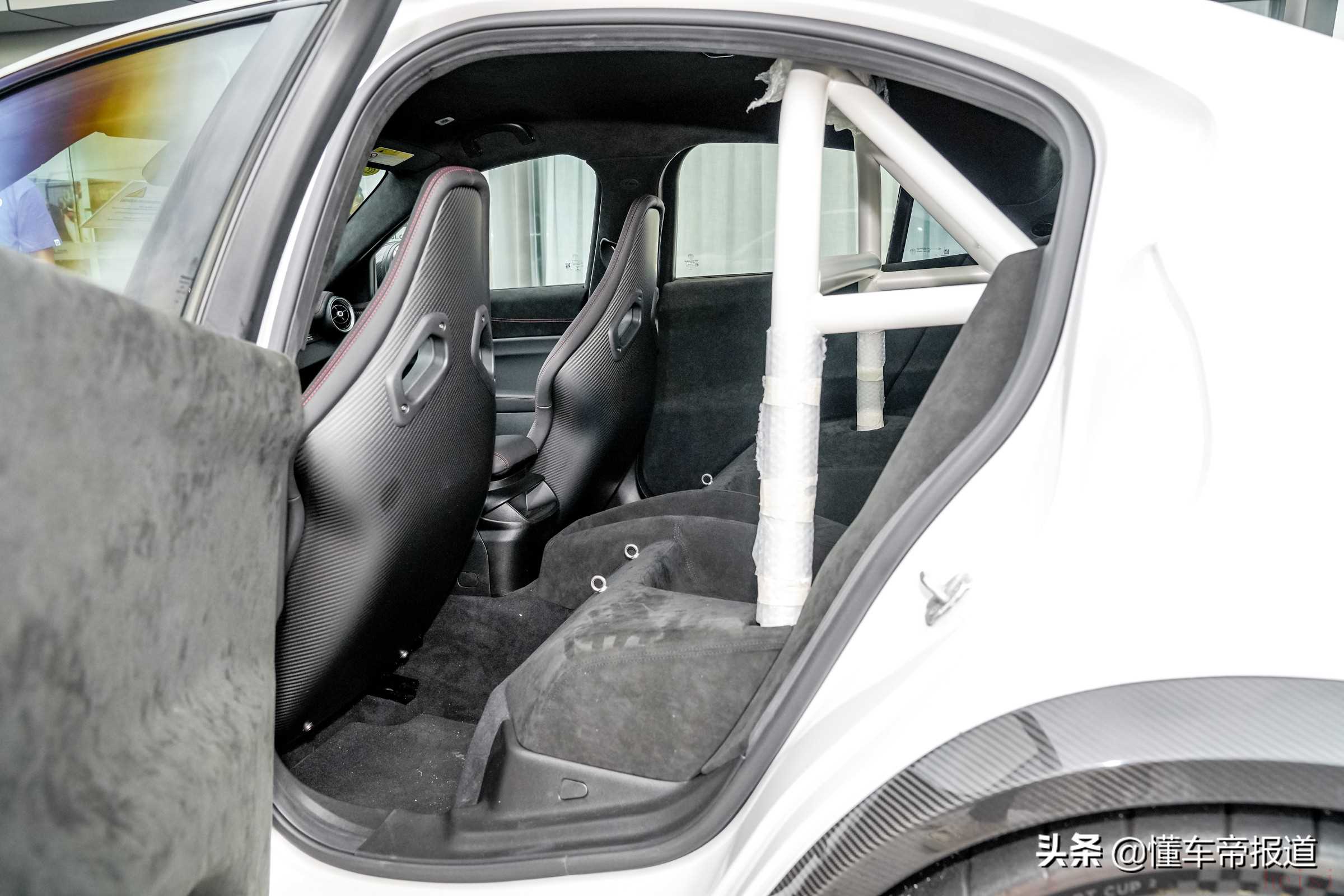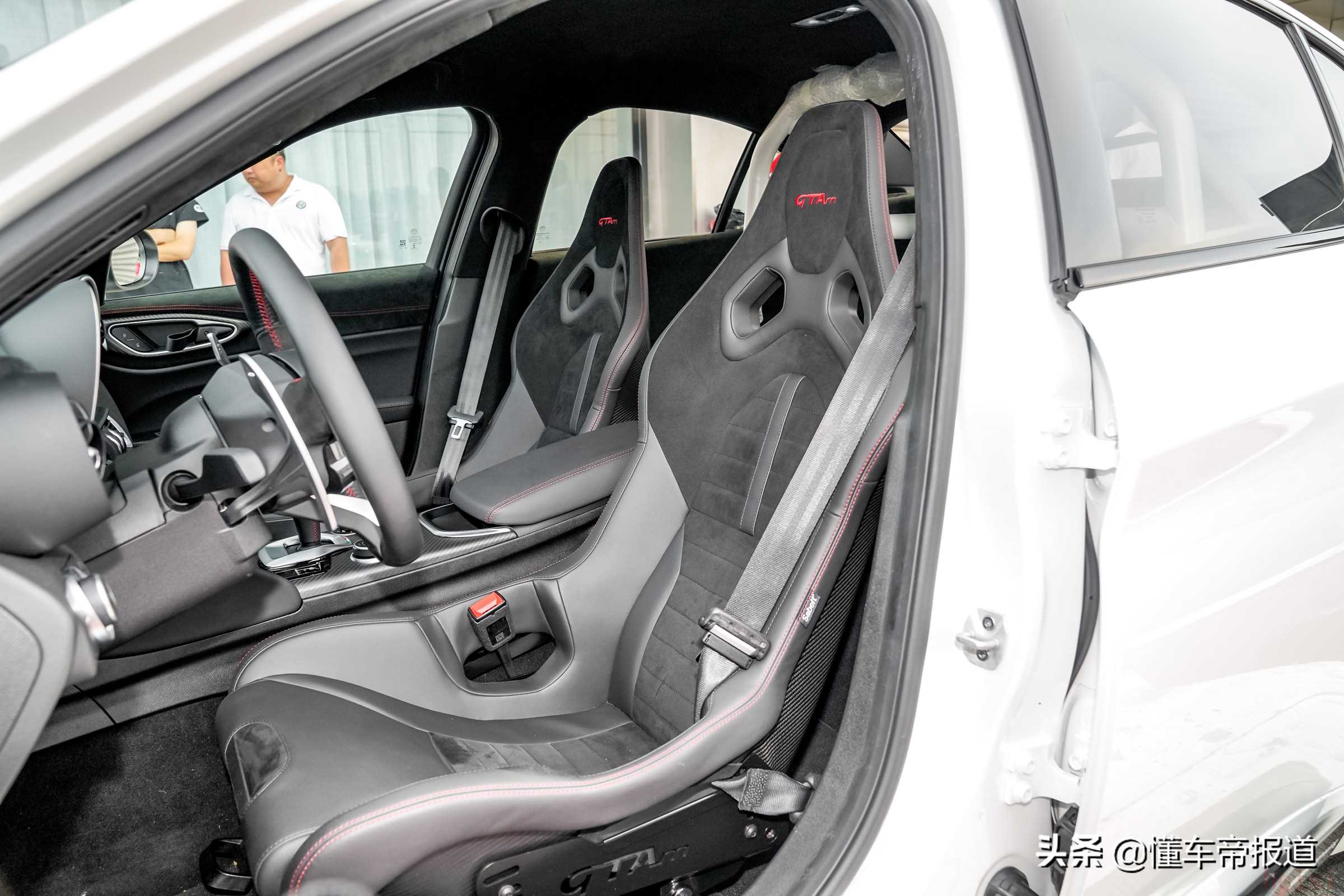 在更加賽道化的Giulia GTAm版本中,為了更加極致的輕量化,該車拆除了后排座椅,并且增加了可收納固定頭盔與滅火器的空間。相比Giulia GTA,這款車增加了更加賽車化的防滾翻架,前車門采用“拉環(huán)”式開啟方式以及6點(diǎn)式安全帶。該車在實(shí)用性上的放棄也換來了更加極致的賽道化風(fēng)格。