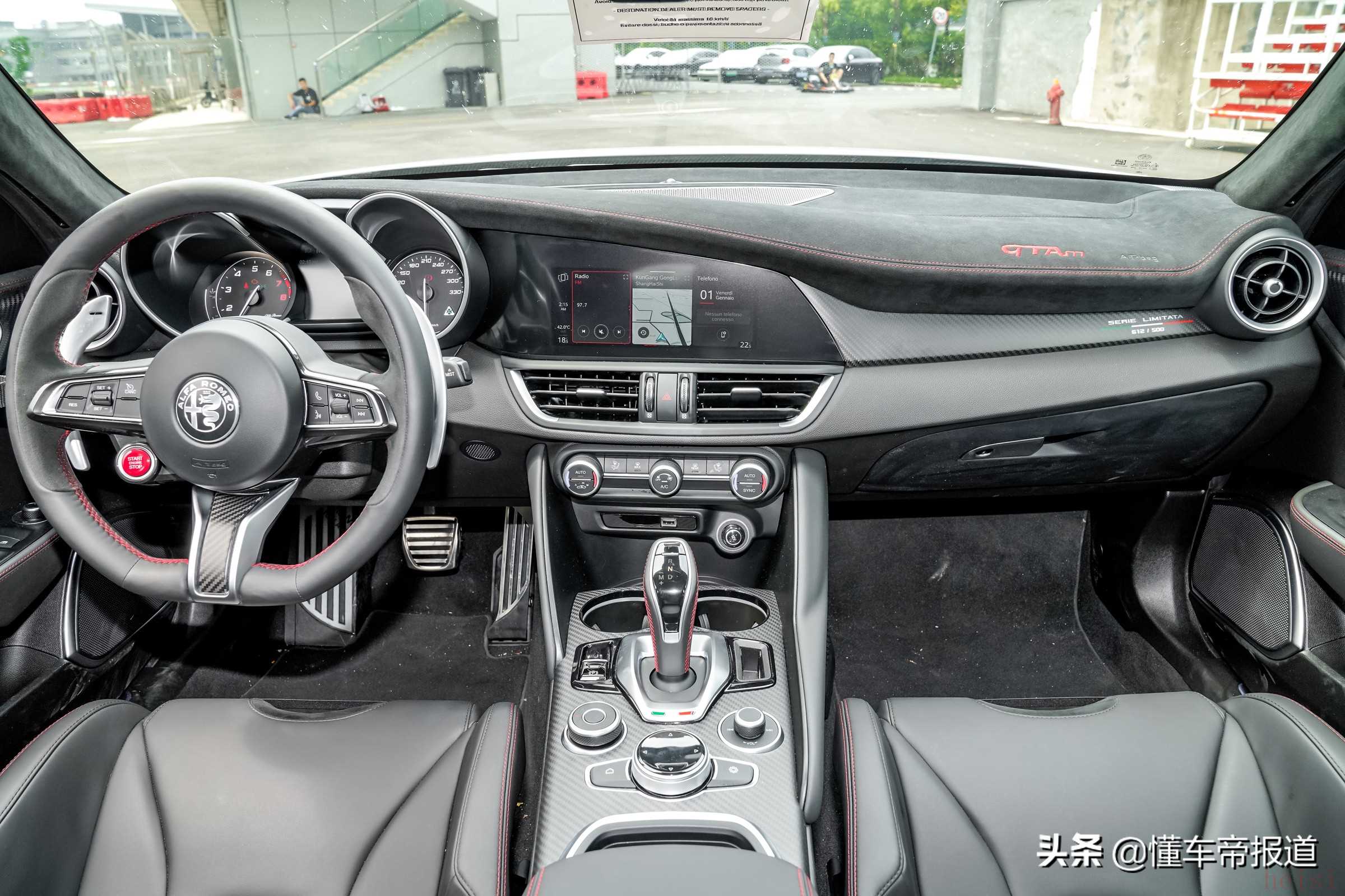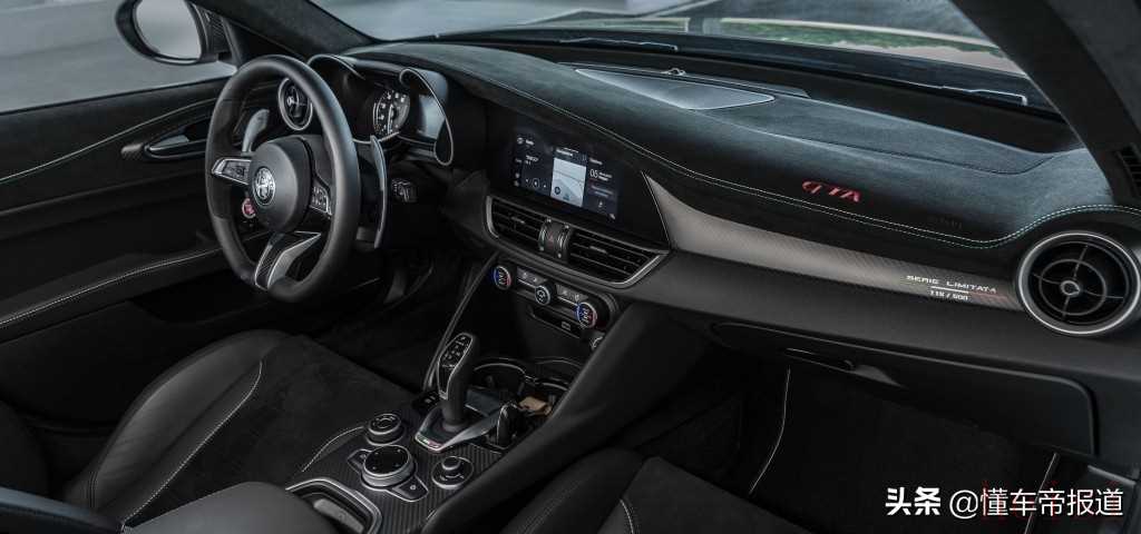 進(jìn)入車內(nèi),外觀濃烈的“戰(zhàn)斗”氛圍同樣被帶到內(nèi)飾。Giulia GTA在延續(xù)Giulia四葉草版內(nèi)飾設(shè)計(jì)的基礎(chǔ)上,在儀表盤、門板、雜物箱、側(cè)柱和座椅中央?yún)^(qū)域全部使用Alcantara材質(zhì)包裹,這種材質(zhì)目前幾乎已經(jīng)成為性能取向或高端車型的“標(biāo)配”。