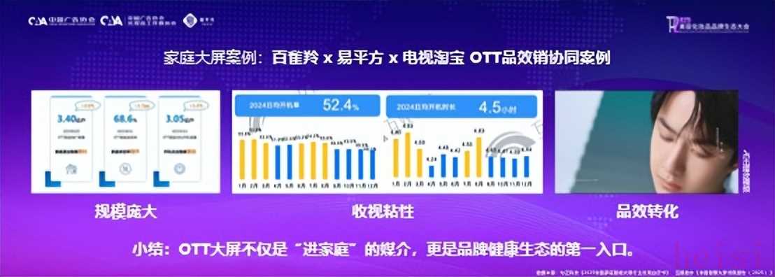在內(nèi)容維度,據(jù)《2024中國(guó)家庭智慧大屏消費(fèi)白皮書》顯示,大屏內(nèi)容憑借71%的廣告記憶度,已成為重建品牌公信力的可信任媒體,“看得見的真實(shí)”正在替代“刷得快的種草”;在渠道維度,OTT大屏與戶外場(chǎng)景的聯(lián)動(dòng),可構(gòu)建“在家看到、出門記得、購(gòu)買觸達(dá)”的立體傳播鏈。