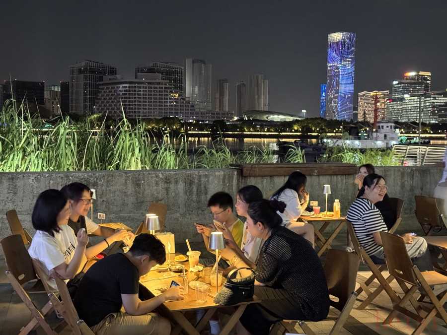 靜安大悅城“夜食天臺(tái)”夜間的外擺區(qū)域熱鬧非凡。