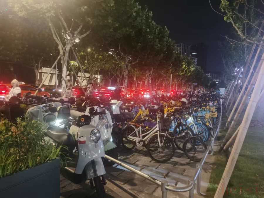 某處“夜間經(jīng)濟(jì)人氣地標(biāo)”人行道被共享單車(chē)占滿(mǎn),晚上外圍道路十分擁擠,打車(chē)十分不便。