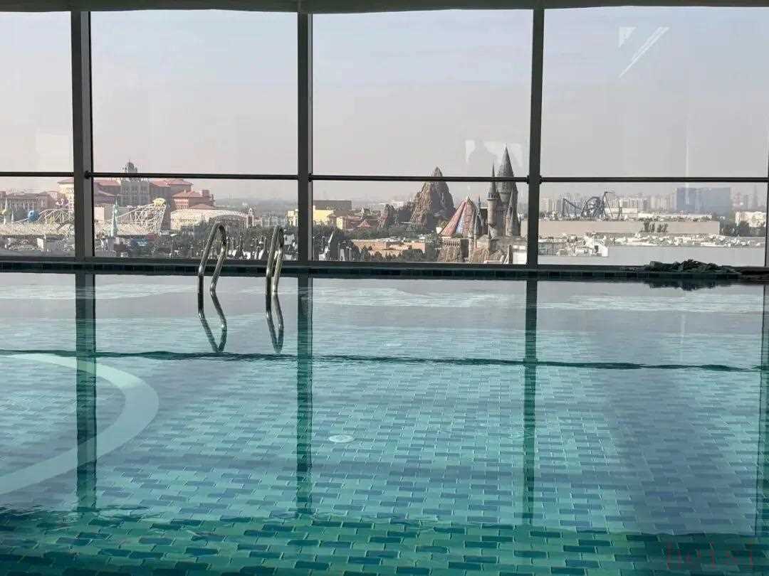 十層的無(wú)邊泳池已注滿水,站在池邊可清晰看到環(huán)球影城哈利波特城堡的尖頂。在這里游泳時(shí),抬頭就能望見(jiàn)城堡的燈光秀。