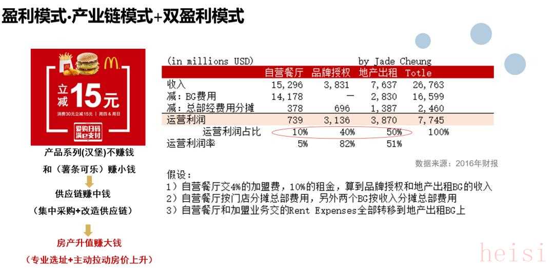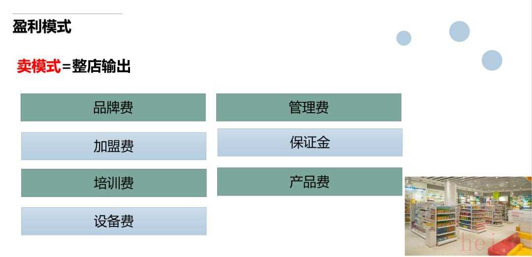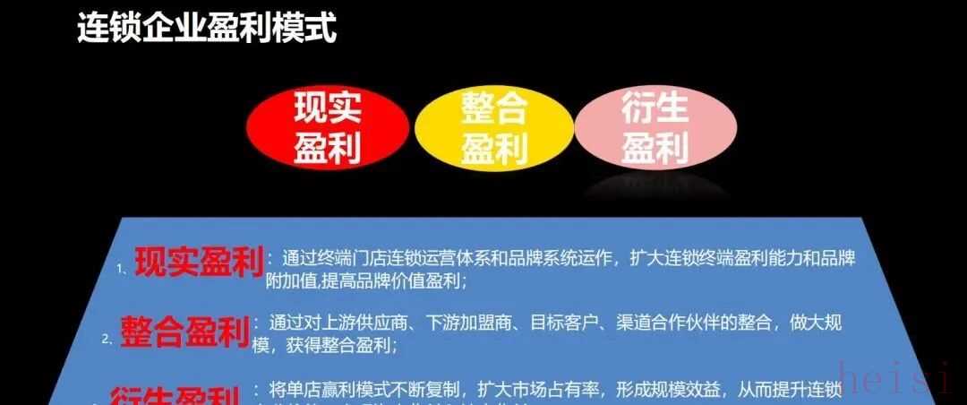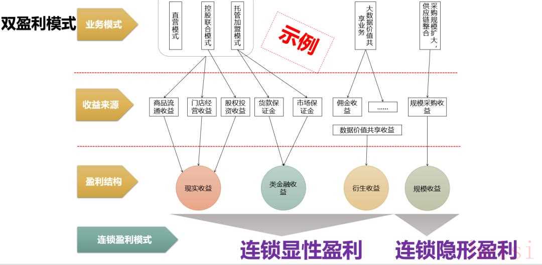 盈利模式賣模式:品牌費,加盟費產(chǎn)業(yè)鏈:上游收益,下游收益雙盈利:顯性收益,隱性收益