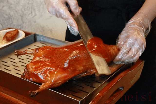 還是現(xiàn)在為數(shù)不多的傳統(tǒng)掛爐果木烤鴨,掛烤的時候會有油脂滴下來,有種隔著屏幕都已經(jīng)聞到了香味的既視感。