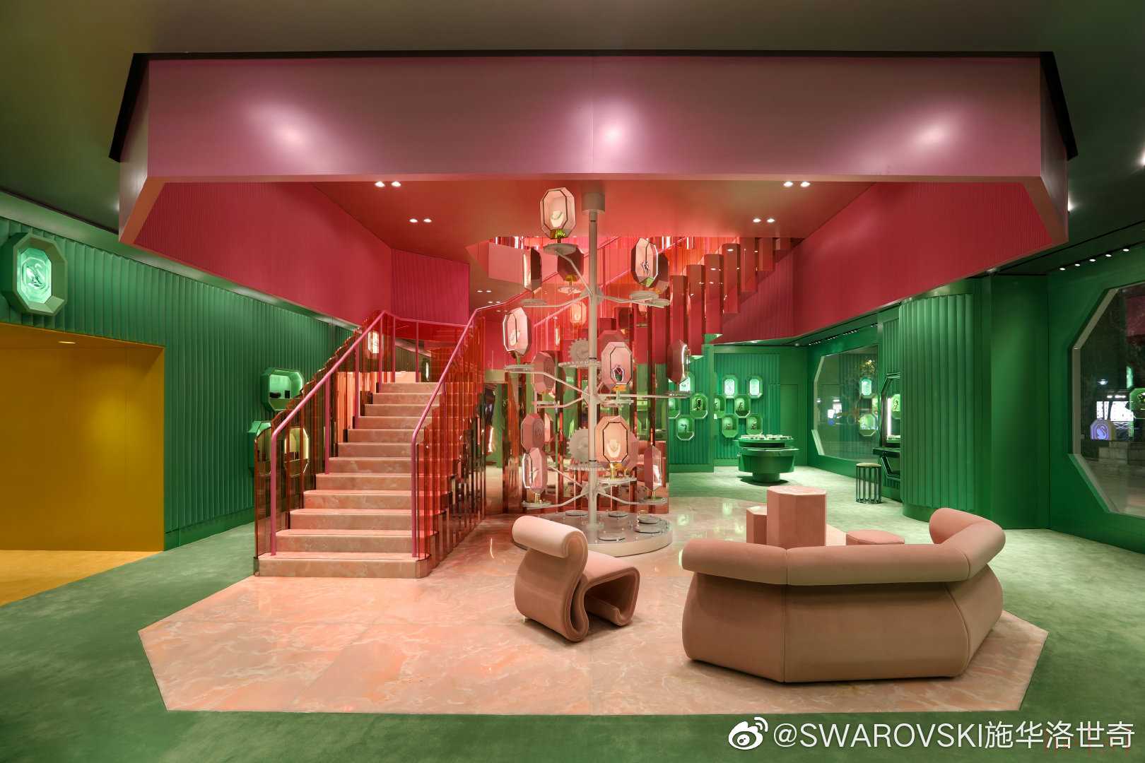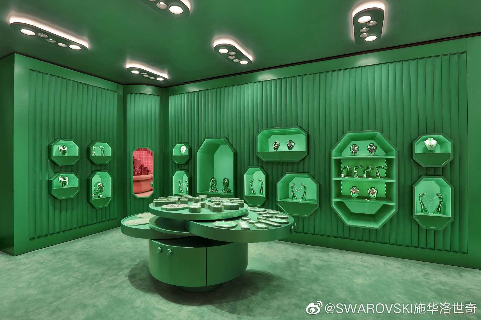 全新旗艦店通過(guò)綠、粉、黃等高飽和度色彩對(duì)整個(gè)空間及功能進(jìn)行了區(qū)分。從珠寶、腕表到配飾、小雕像,這家超大型旗艦店亦展示了施華洛世奇全新系列的仿水晶產(chǎn)品。所有包裝盒也被全部替換成八角形的新盒子,與煥新的品牌Logo相呼應(yīng)。
